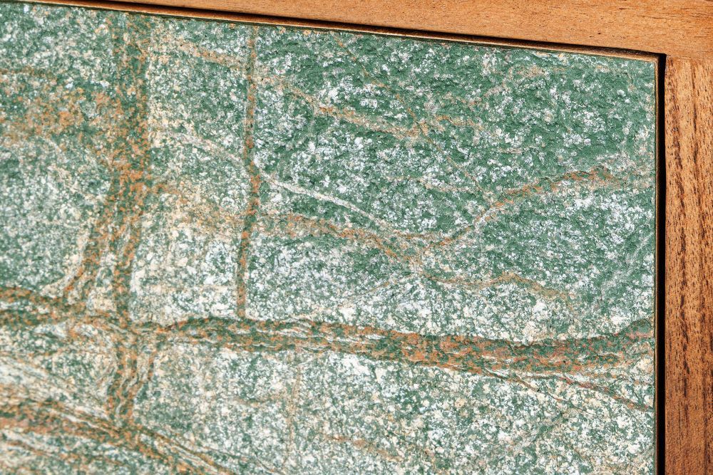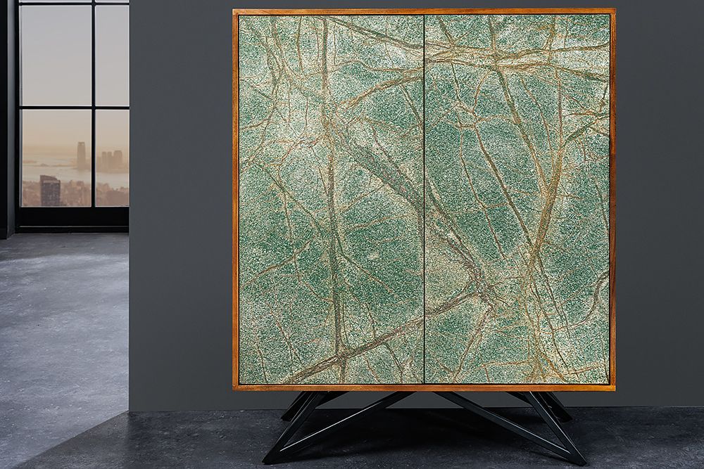 Ovaj ormarić je pravi spoj sofisticiranosti i umjetničkog izraza, savršeno dizajniran za unikatne prostore. Njegova prednja strana, ukrašena drvenim furnirom u mramornoj prirodnoj kamenoj optici, donosi dojam luksuza i elegancije, pretvarajući ga u pravi vizualni dragulj. Svaki detalj ovog komada pažljivo je osmišljen kako bi stvorio harmoničan balans između prirodnih materijala i suvremenog dizajna.