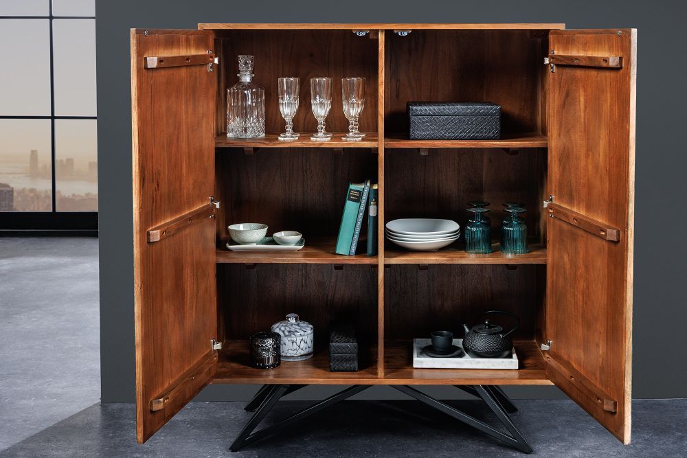 U prirodnim tonovima, tijelo ormarića od lakiranog drva akacije utjelovljuje toplinu i autentičnost, dok su prednje strane drvenog furnira u prirodnoj boji savršeno usklađene s crnim okvirom od željeza s praškastim premazom, koji dodaje modernu notu.