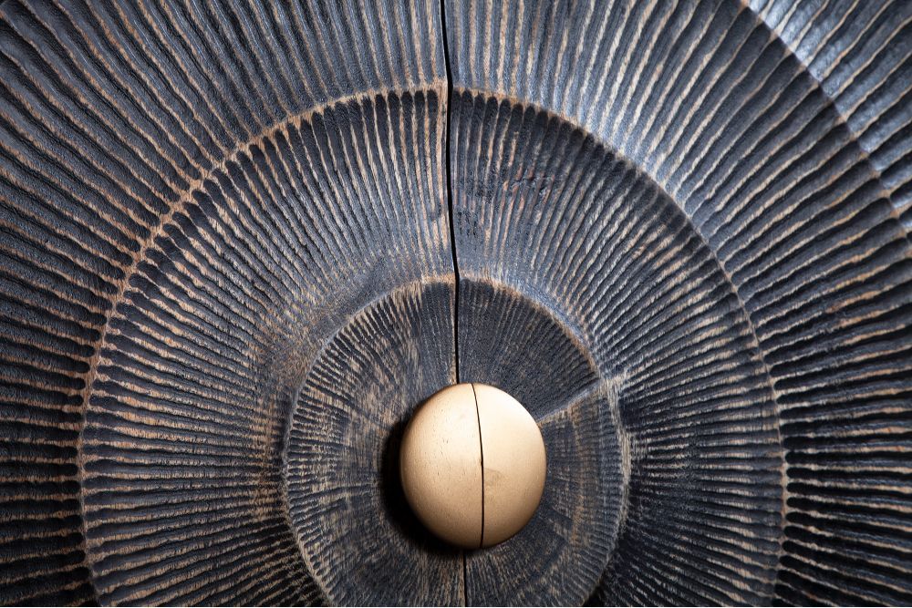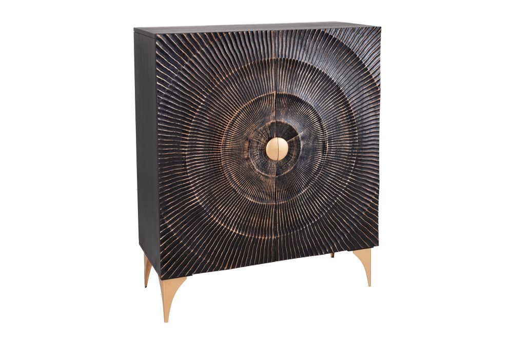 Ormarić je elegantan i sofisticiran, dimenzija približno 100 cm u širinu, 120 cm u visinu i 38 cm u dubinu. Izrađen je od lakiranog drva manga u dubokoj crnoj boji, ukrašen bogatim zlatnim ornamentima na vratima. Vrata se otvaraju uz magnetsko zatvaranje, otkrivajući šest prostranih odjeljaka dimenzija 47 cm x 31 cm x 33 cm, idealnih za pohranu. Stabilnost mu daju zlatne metalne noge visine 19 cm, koje dodatno ističu njegov luksuzni izgled, stvarajući savršenu ravnotežu između stila i funkcionalnosti.