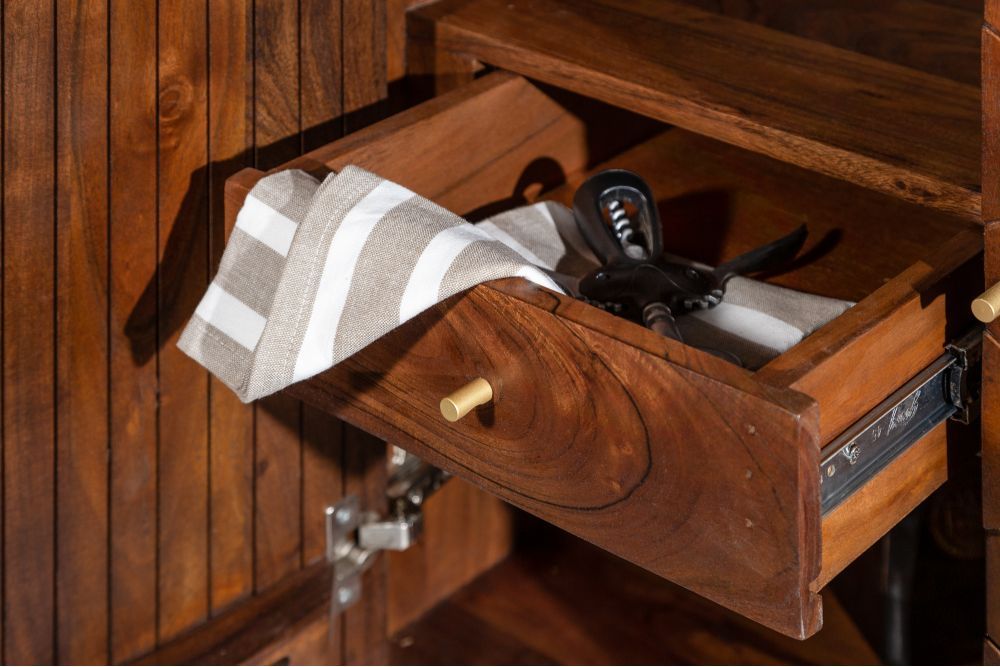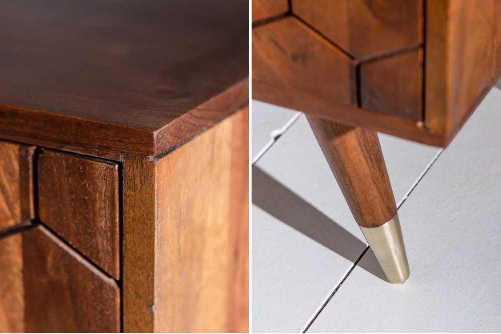 Izrađen od masivnog drva akacije, s prirodnom bojom koja varira od svijetlih do tamnih nijansi, blista pod svjetlom. Zlatne metalne aplikacije dodaju luksuz i kontrast.