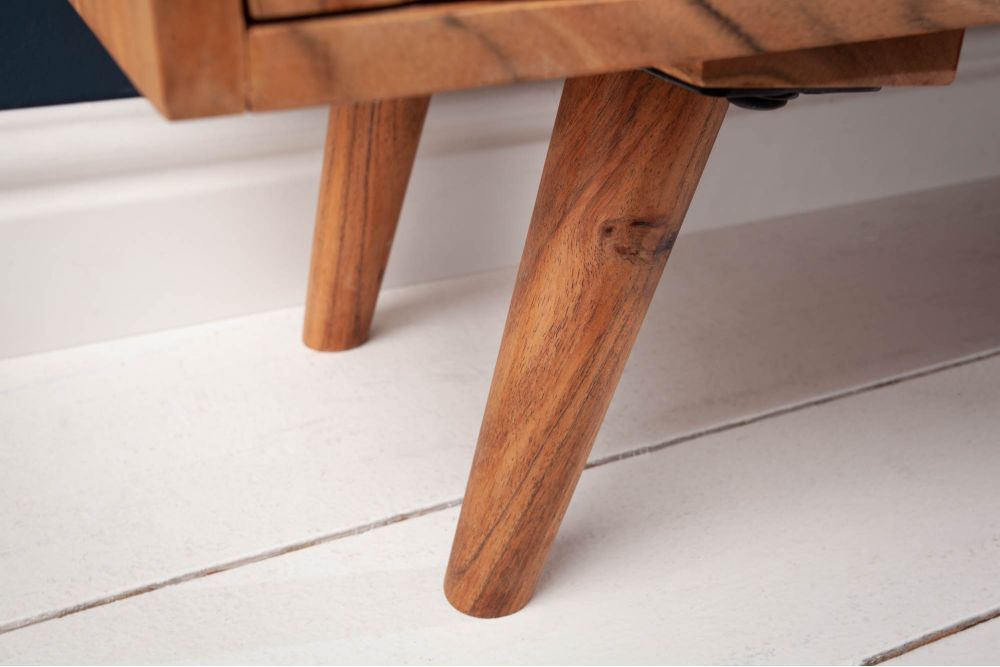 Prirodna smeđa boja ormarića ističe karakter drva, naglašavajući jedinstvenu teksturu i uzorak akacije. Lakiranje ne samo da dodaje sjaj, već također štiti drvo, osiguravajući njegovu dugovječnost i otpornost na svakodnevno korištenje. Ova obrada čini svaki komad jedinstvenim, osiguravajući da nijedna površina nije identična drugoj.