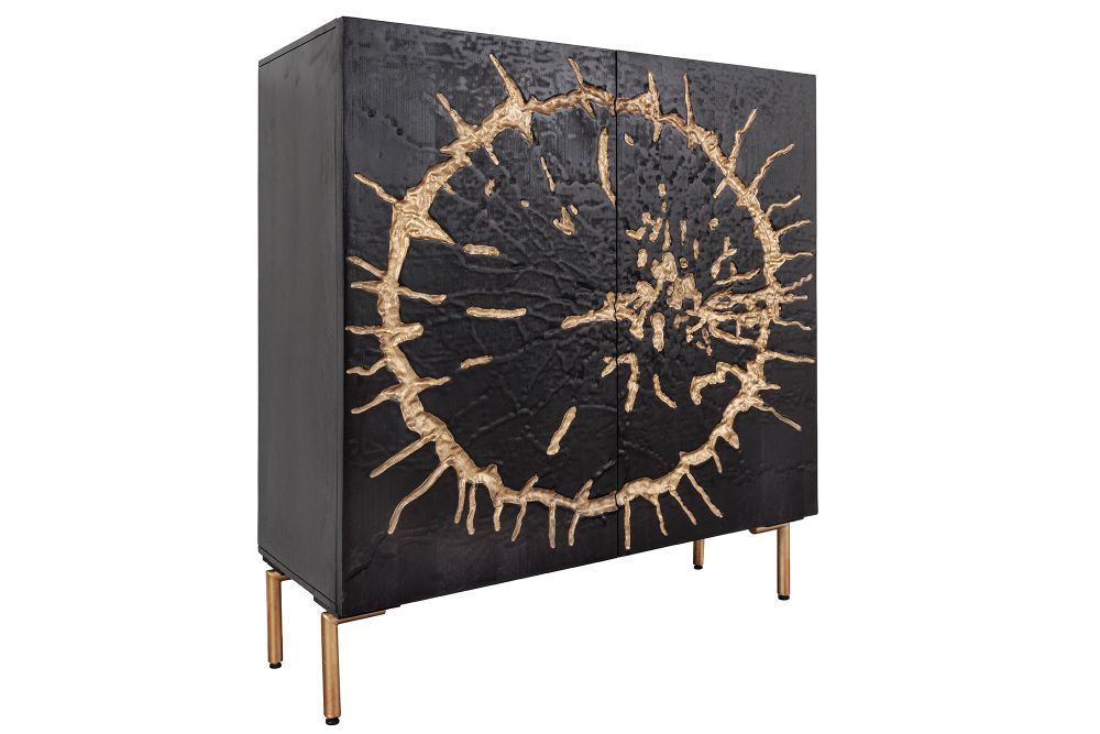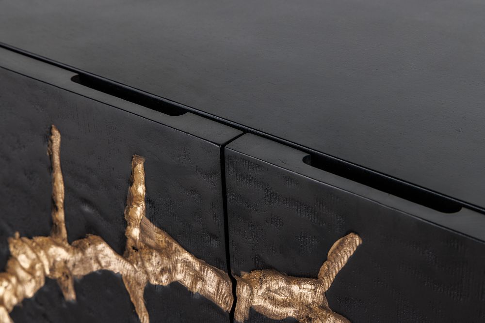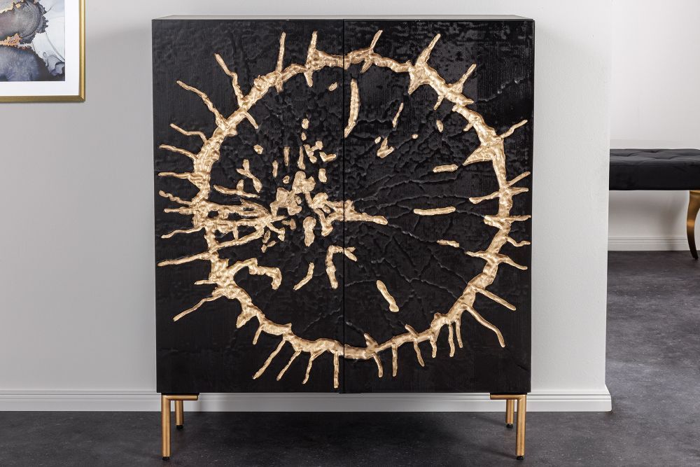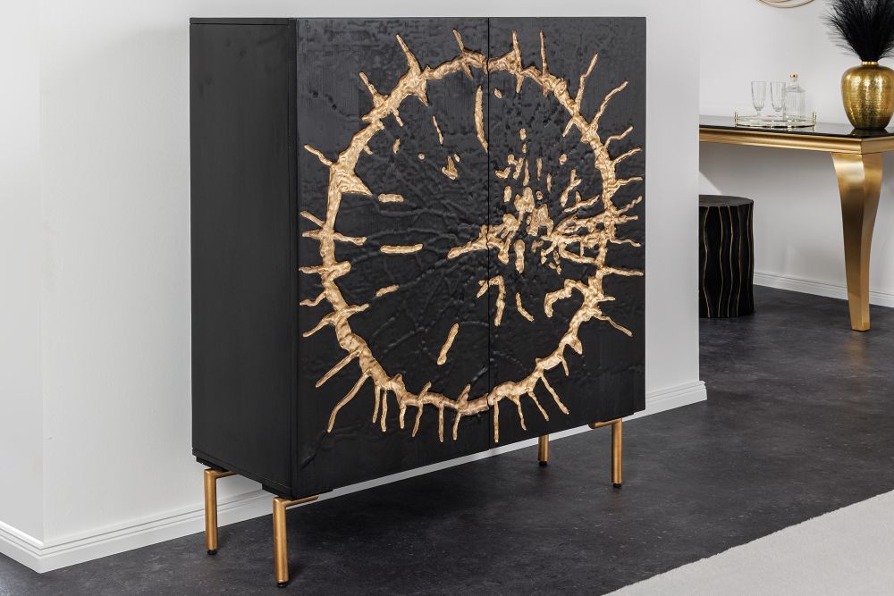 Ovaj ormarić odiše luksuzom i apstraktnom elegancijom. Prednja strana, izrađena od lakiranog drva manga, očarava svojim jedinstvenim crno-zlatnim dizajnom. Zlatni ornament na crnoj pozadini djeluje poput eksplozije svjetlosti, nalik organskom, neobičnom uzorku koji se širi iz središta prema rubovima, stvarajući vizualni dojam dinamike i pokreta. Zlatne, metalne noge savršeno nadopunjuju ornament, dajući ormariću dodatni sjaj i stabilnost.