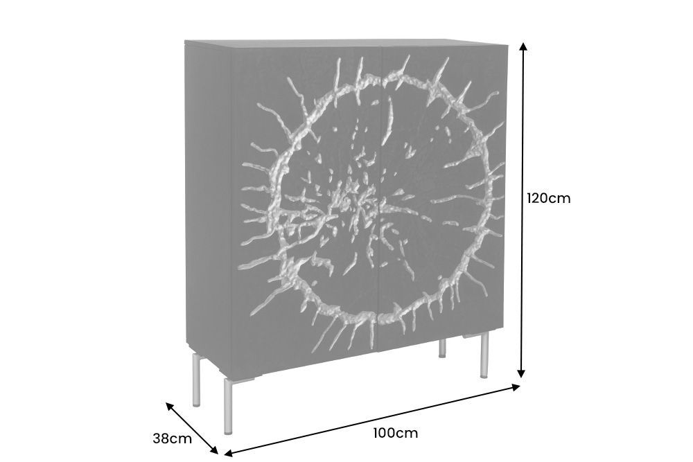 Dimenzije ovog komada odražavaju njegovu prisutnost u prostoru, s približnim mjerama 100 cm širine, 120 cm visine i 38 cm dubine, čineći ga prikladnim za različite interijere koji traže mješavinu funkcionalnosti i umjetničke izražajnosti.