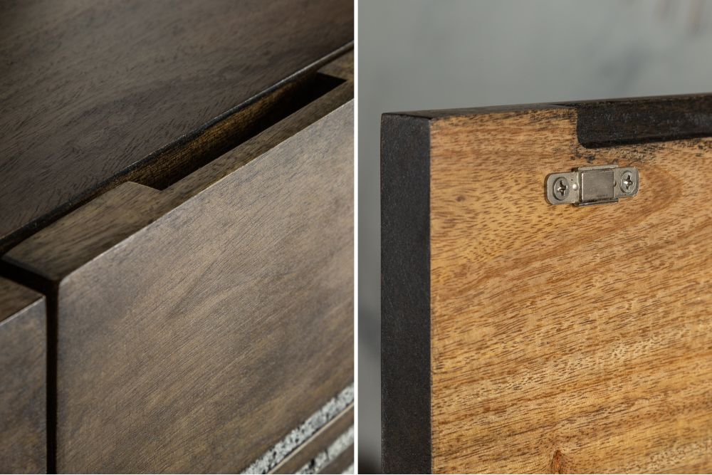 Urađen od masivnog mangovog drva, ovaj komad namještaja oduševljava svojom prirodnom smeđom bojom koja evocira slike sunčanih plantaža i bogatih, zlatnih nijansi zemlje. Drvo je pažljivo obrađeno, a svaki detalj pažljivo osmišljen, čime se naglašava njegova jedinstvena tekstura. Metalni okvir, sa visinom od 21 cm, dodaje suvremeni element, stvarajući kontrast koji se savršeno uklapa u bilo koji stil interijera.