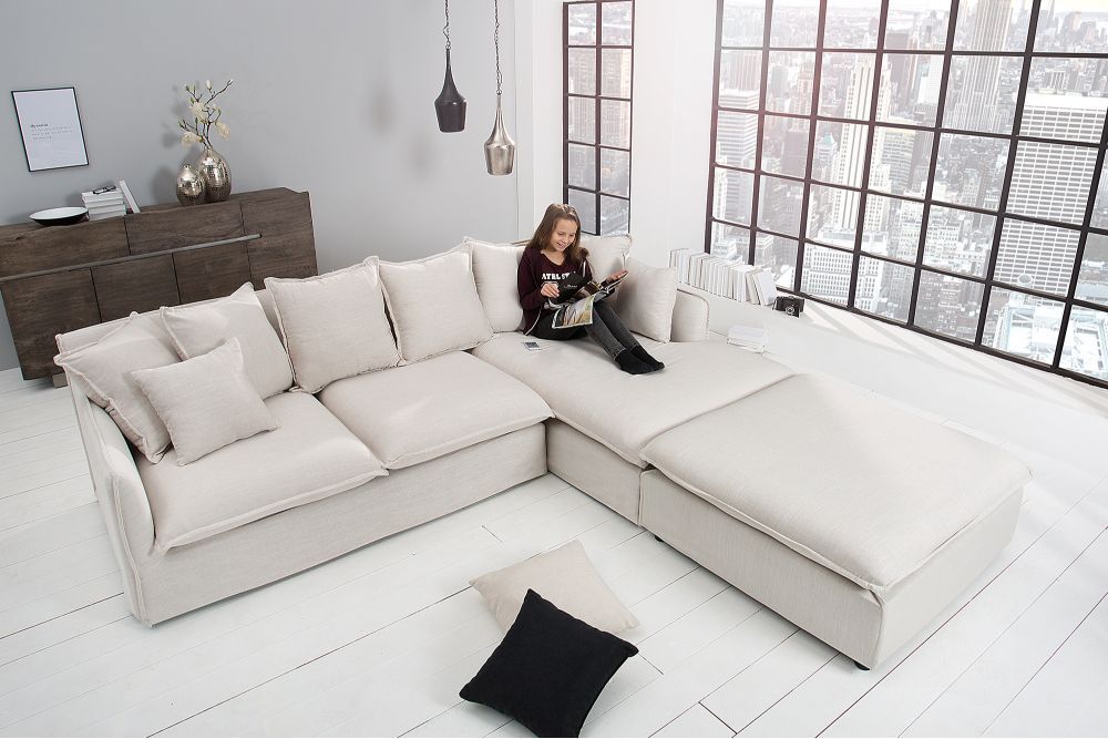 Visina naslona od 50 cm savršeno podupire leđa, dok šest velikih jastuka od 50 cm i dva manja jastuka od 35 cm pružaju dodatnu udobnost i prilagodljivost. Nosag opruge unutar okvira osiguravaju optimalnu podršku, dok jezgra od opruga u sjedištima donosi onaj osjećaj opuštenosti, kao da vas sofa nježno grli.