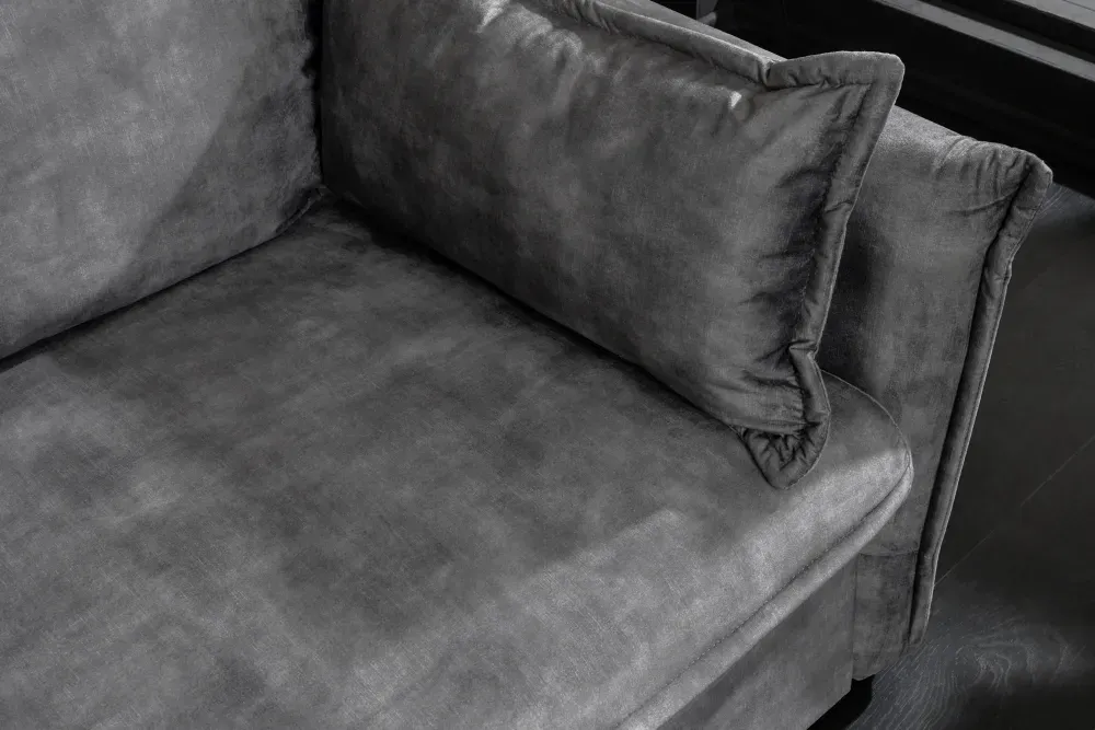 Ova sofa na razvlačenje u elegantnoj sivoj baršunastoj izvedbi stvorena je za suvremeni način života. Bilo da se opuštate nakon dugog dana ili dočekujete goste na noćenju, ova sofa nudi savršen spoj estetike, udobnosti i funkcionalnosti.