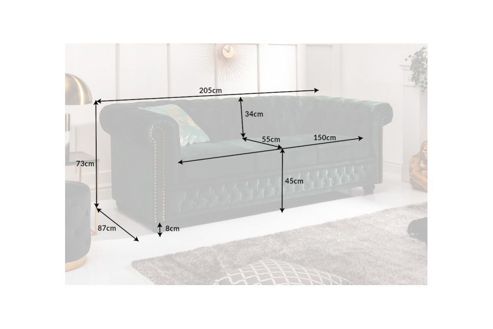 Iako je njezin izgled utemeljen na klasičnom Chesterfield dizajnu, ova sofa ujedinjuje prošlost i sadašnjost – njezin pravi naslon nudi udobnost koju ne možete odoljeti, a čvrste noge od masivnog drva nježno podupiru cijelu strukturu. Bezvremenski šarm ove sofe nije samo u njezinoj funkcionalnosti, već i u njezinoj sposobnosti da svaki prostor obogati estetikom i toplinom, ostavljajući neizbrisiv dojam.