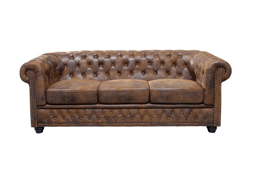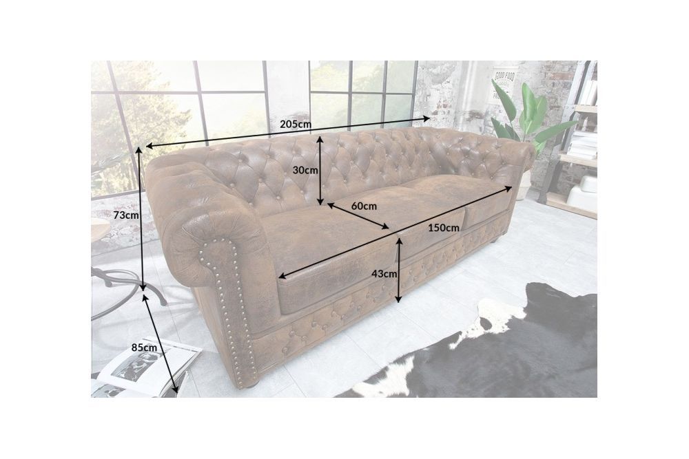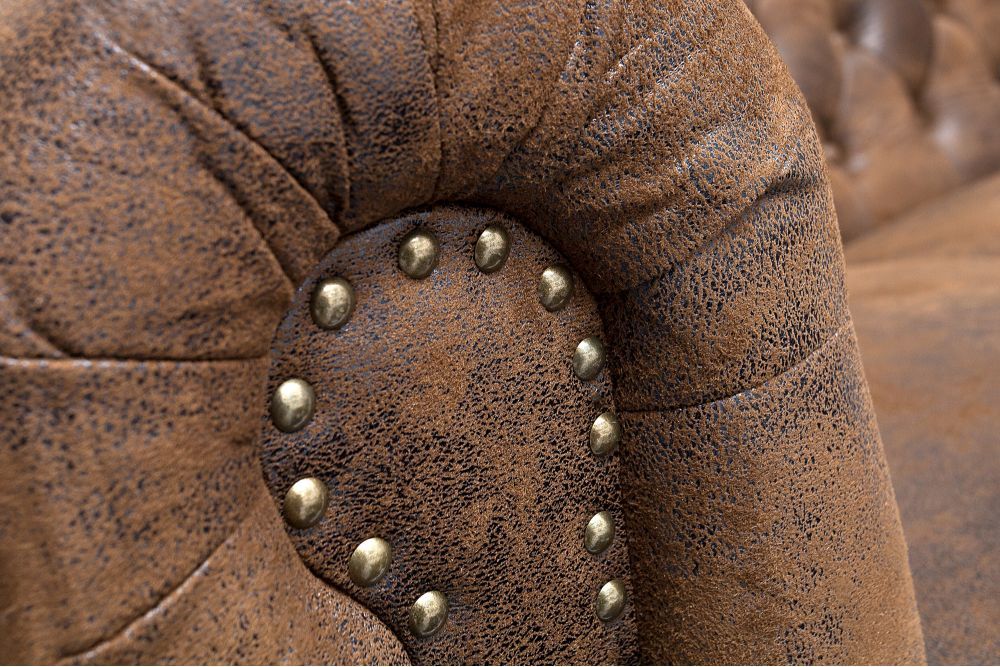 Ova sofa priča priču o eleganciji prošlih vremena, prenesenu u suvremenost s dozom nostalgične raskoši. Čvrsto postavljena na stabilnom okviru od masivnog tvrdog drveta, utjelovljuje trajnost i snagu, temelj svakog pravog umjetničkog djela. U svojoj smeđoj boji s antiknim efektom, sofa odiše toplinom, doziva uspomene na salone prošlih stoljeća, gdje su se ljudi okupljali u razgovoru i smijehu.