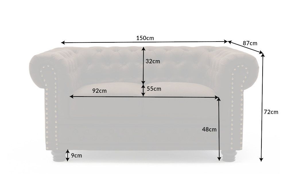 Masivno drvo, lakirano i elegantno oblikovano u nogama sofe, osigurava ne samo stabilnost već i povijesnu težinu, koja je, uz pravi naslon, činila Chesterfield stil legendarnim. Visina od 72 cm, dubina od 87 cm, te sjedalo od 150 cm, pružaju prostranost i komfor, dok tanjura s oprugama unosi udobnost koja nije samo vizualna, već i taktilna.
