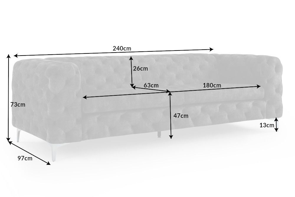 Chesterfield dizajn, s prepoznatljivim ukrasnim šavovima, dodatno oplemenjuje cijeli dojam, donoseći osjećaj tradicije pomiješan s modernom estetikom. Pravi naslon pruža savršenu podršku, dok tanjura s oprugama unosi udobnost koja traje. Ova sofa svojim impozantnim dimenzijama (240 cm) postaje centralna točka svakog prostora, s profinjenim srebrnim naglaskom koji joj daje dašak luksuza i sofisticiranosti.