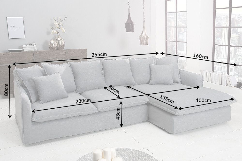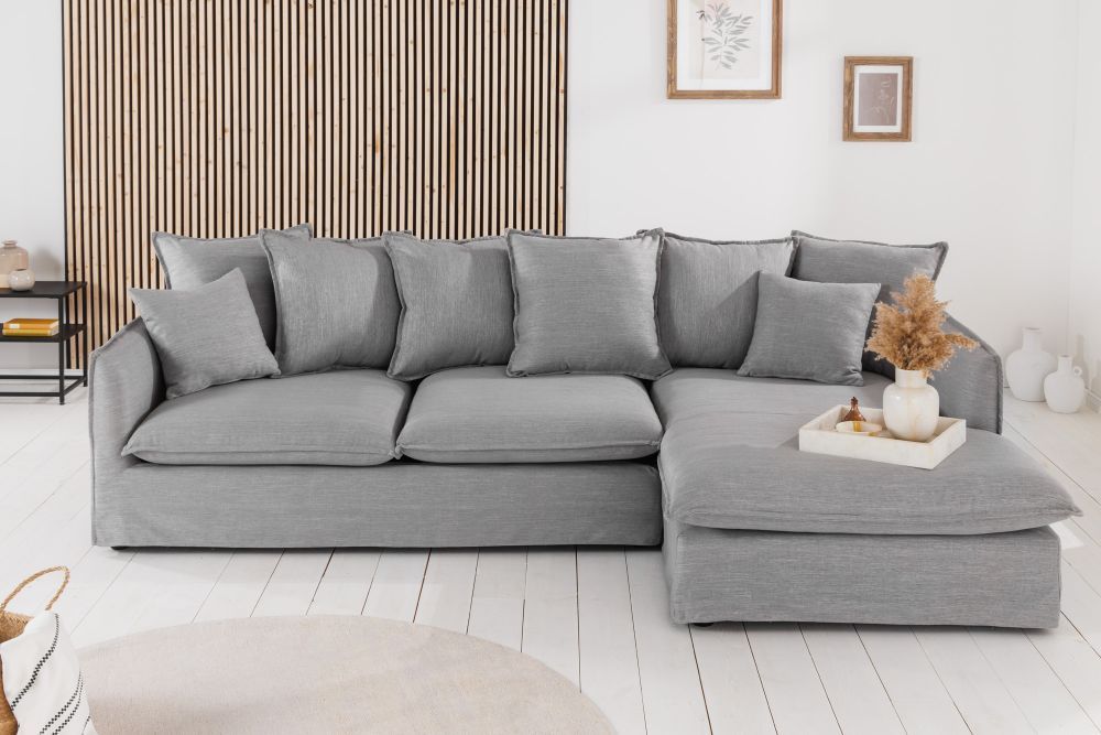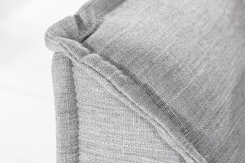 Presvučena u nježno sivu tkaninu, strukturiranu i podatnu, ova sofa je kao oblak u koji možete uroniti. Spoj poliestera, lana i viskoze omogućava trajnost bez gubitka na mekoći, dok se navlaka može jednostavno skinuti i oprati, čime ovaj komad namještaja postaje i praktičan za svakodnevnu upotrebu. Visina naslona od 50 cm pruža idealnu potporu leđima, uz dodatni luksuz osam jastuka – šest velikih i dva manja – koji se prilagođavaju svakom položaju, stvarajući personaliziranu udobnost.