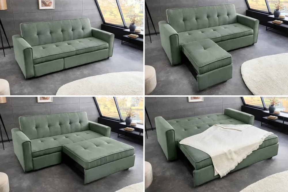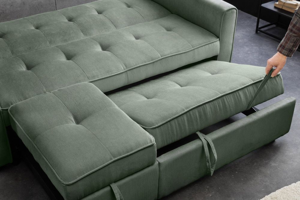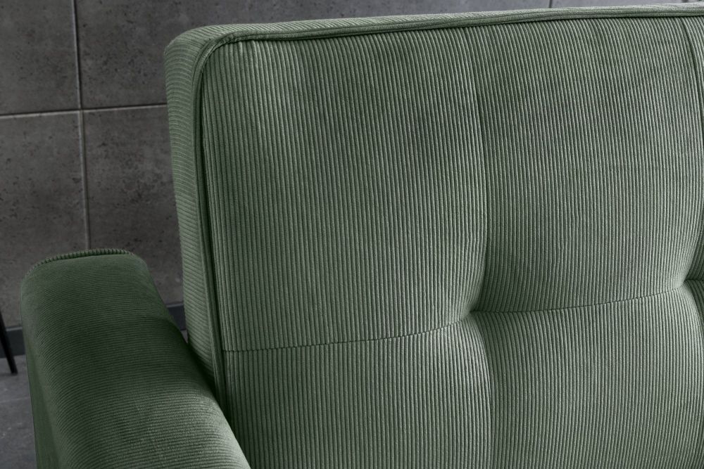 Sofa na razvlačenje u svježoj zelenoj nijansi unosi prirodnu energiju i opuštenu eleganciju u svaki prostor. Presvučena mekim rebrastim kord materijalom, pruža topao i ugodan osjećaj, dok njezina čvrsta konstrukcija jamči dugotrajnost i stabilnost. Crne noge daju moderan kontrast, a kompaktna forma širine 180 cm i dužine 90 cm čini je idealnim rješenjem za suvremene interijere.