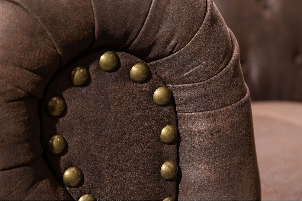 Presvlaka od mikrofibre, u toploj vintage smeđoj boji, unosi dašak prošlih vremena u prostor, no istovremeno nudi modernu funkcionalnost i jednostavno održavanje. Ukrasni gumbi i zakovice u Chesterfield stilu dodaju sofisticiranu dozu detalja, stvarajući vizualnu dinamiku koja oduzima dah. Pravi naslon čini ovu sofu savršenim mjestom za opuštanje, dok tanjura s oprugama pruža udobnost koja traje.