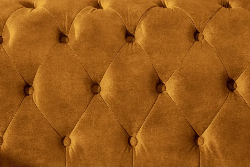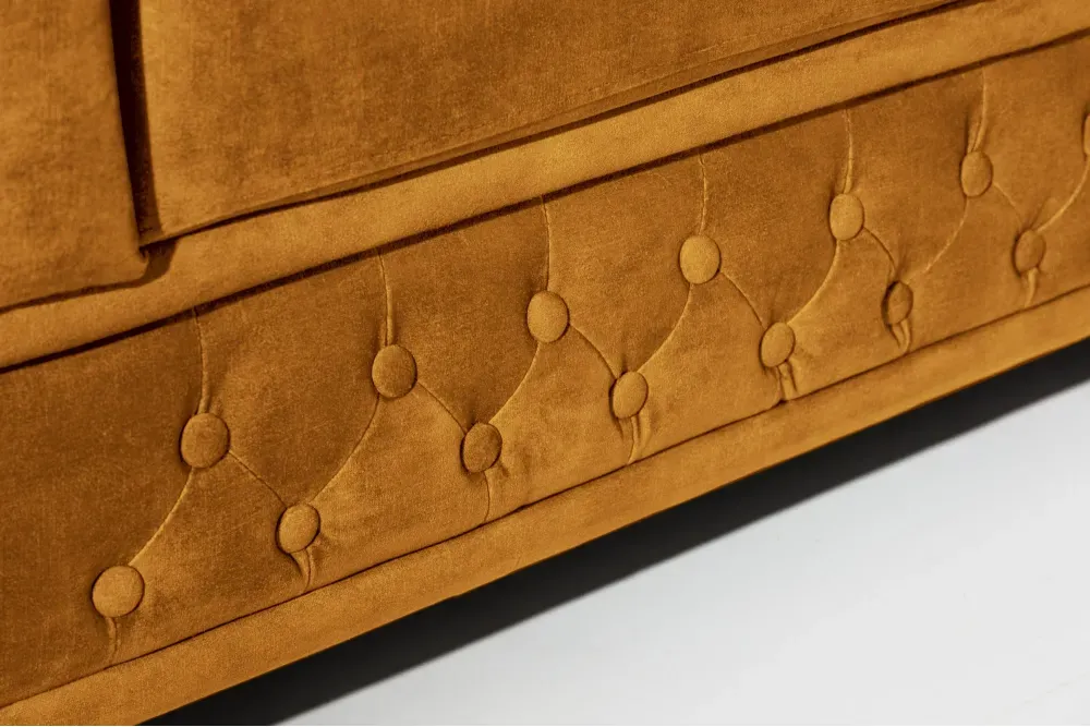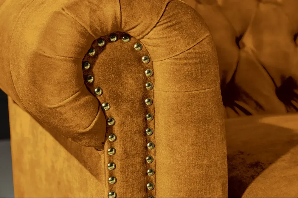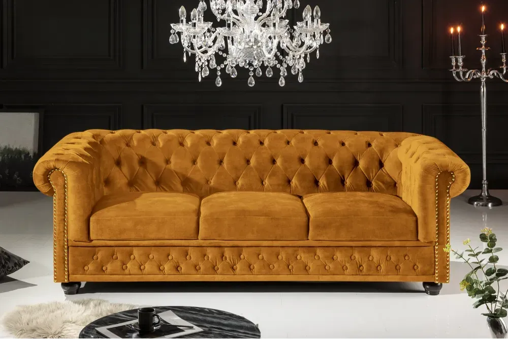 Ova sofa u upečatljivoj mustard žutoj baršunastoj izvedbi spaja britanski klasični šarm s modernom dozom karaktera. Ova nijansa unosi toplinu, optimizam