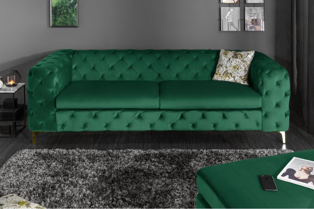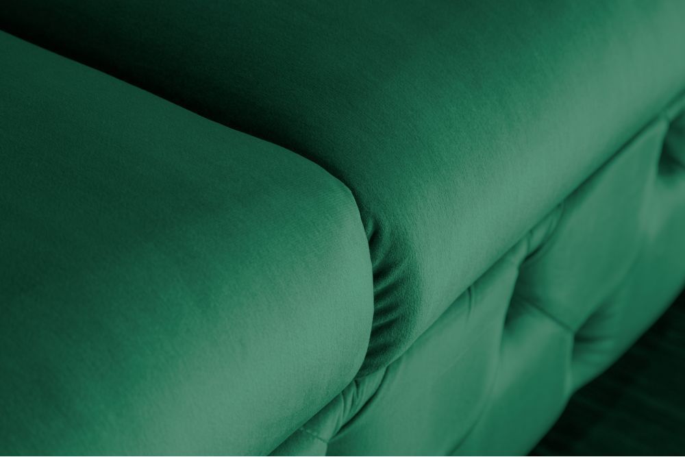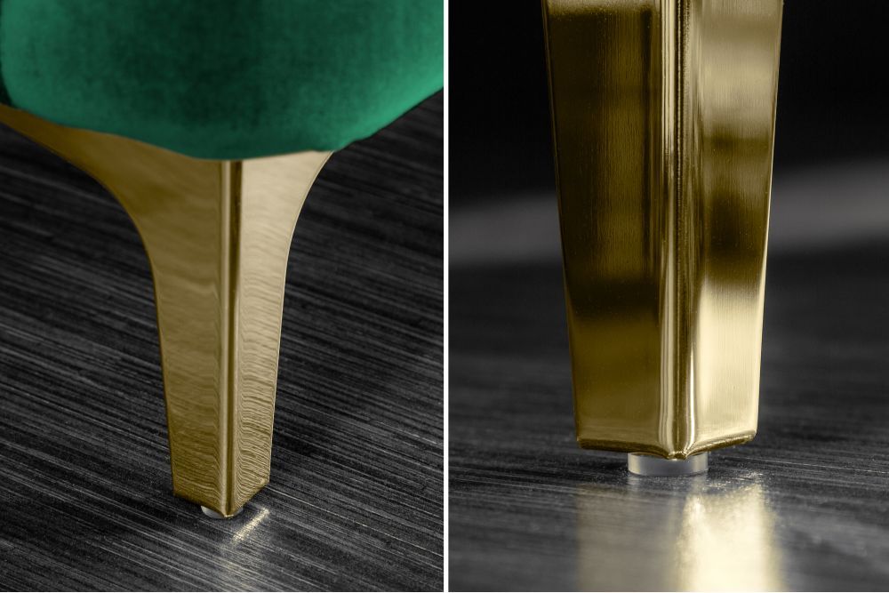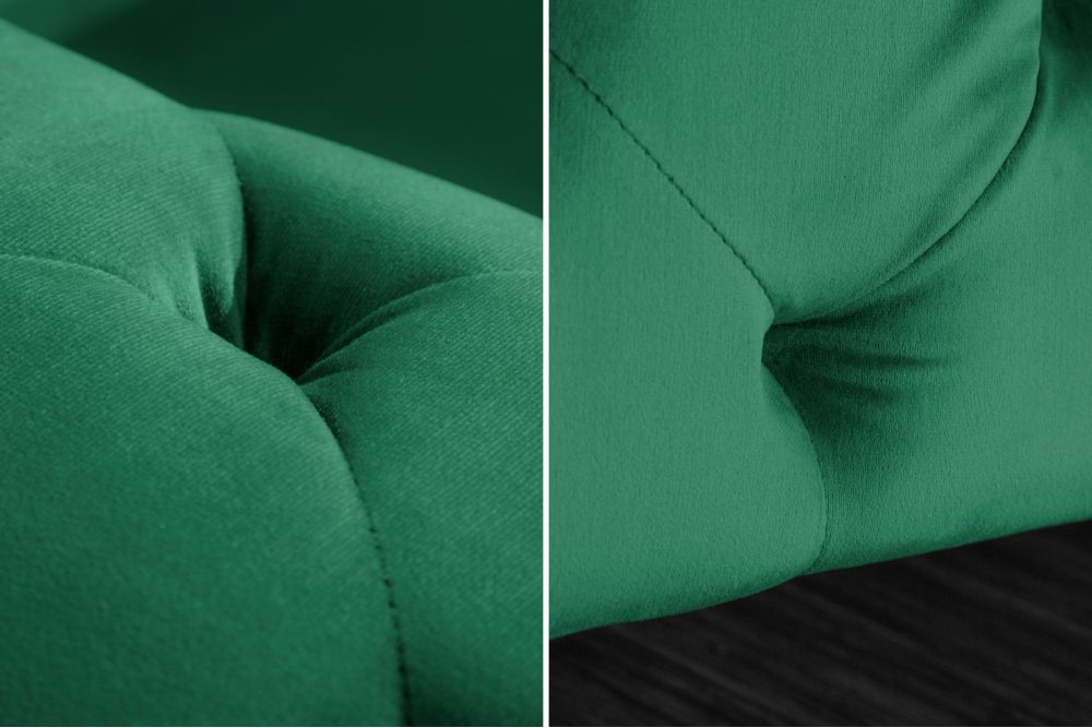 Ova sofa je prava oaza luksuza, dizajnirana da unese sofisticiranost u svaki prostor. Postavljena na čvrsti drveni okvir, njena stabilnost osigurana je tvrdim drvom, koje omogućava dugovječnost i sigurnost. Ujedno, svaki detalj, od elegantnog smaragdno zelenog baršuna do zlatnih akcenata, govori o raskoši i bogatstvu. Presvlaka od visokokvalitetnog baršuna, u nijansi smaragdne zelene, poziva na dodir i pruža osjećaj ugode i topline, dok zlatne noge i detalji od metala dodaju sofisticirani sjaj.