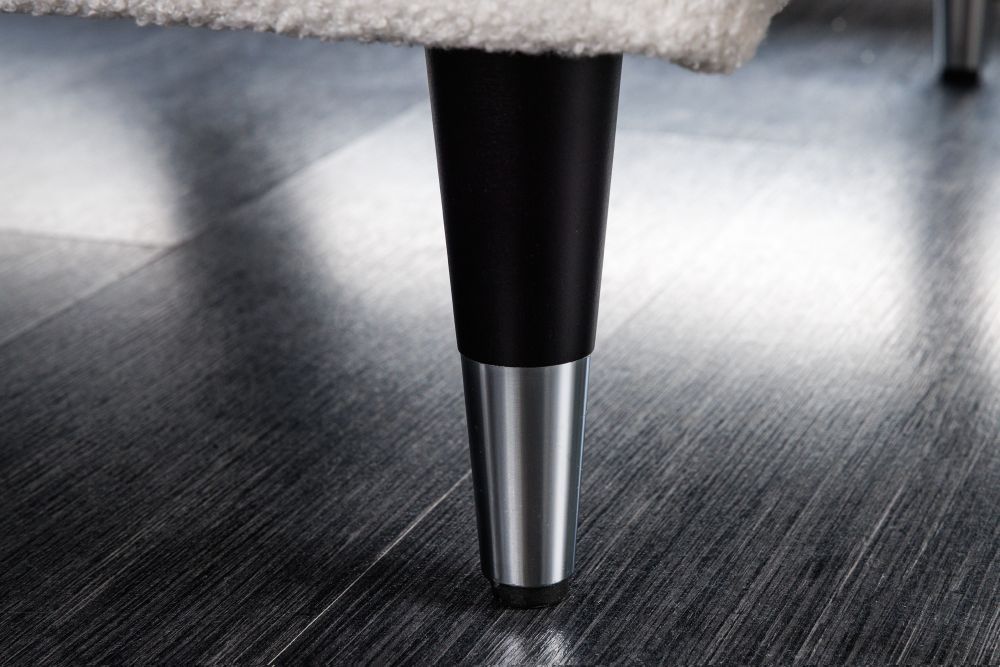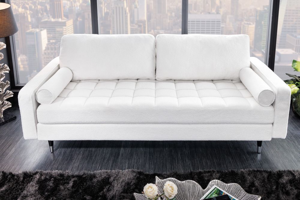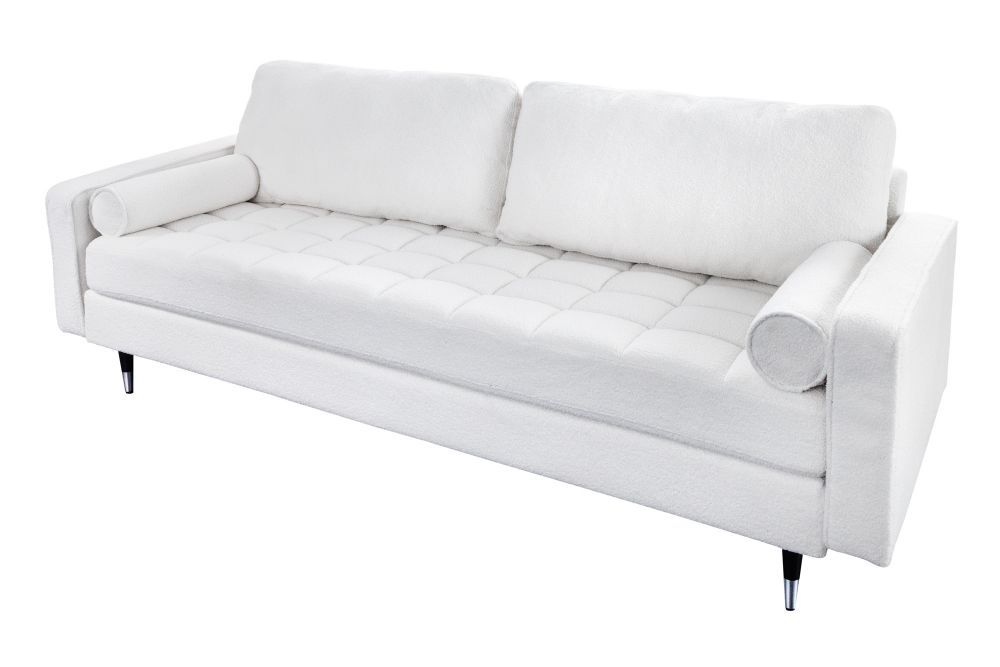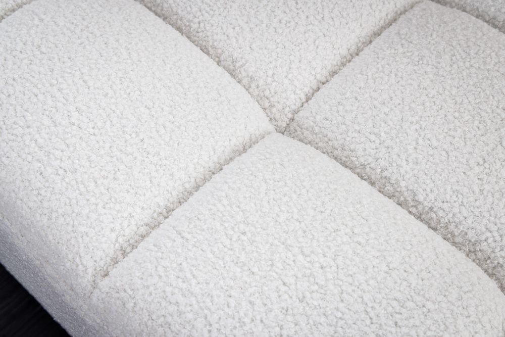 Ova sofa je poput modernog remek-djela, gdje se susreću elegancija i funkcionalnost u savršenoj ravnoteži. Njezin bijeli bouclé materijal, prepun teksture, poziva na dodir, stvarajući osjećaj luksuza i udobnosti. Svaka linija ove sofe odražava promišljenu sofisticiranost, dok su njezini komadi poput malih umjetničkih detalja – veliki jastuci koji se nježno uklapaju u prostor, a manji jastuci nude dodatnu mekoću i podršku.