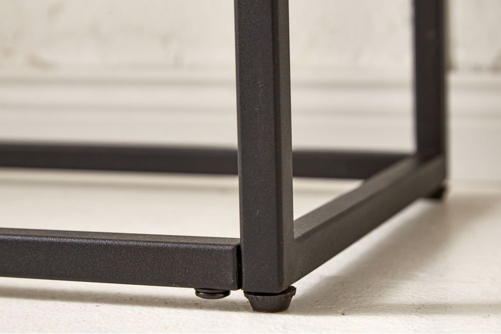 Metalni okvir, debljine 1,5 cm x 1,5 cm, pruža stabilnost i istovremeno naglašava industrijski karakter komada. Kombinacija prirodne boje hrasta i crne boje okvira stvara suptilan kontrast, savršen za moderan interijer. Funkcionalnost se ogleda i u njegovoj mogućnosti korištenja kao stola za laptop, omogućujući da estetika i praktičnost idu ruku pod ruku.