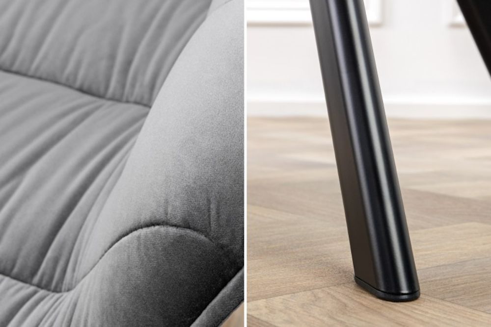 Ova stolica donosi savršen spoj udobnosti i vintage dizajna. Tapecirana u sivi baršun (100% poliester), odiše toplinom i stilom koji odražava bezvremensku eleganciju. Njeno široko sjedalo i visoki naslon osiguravaju podršku i udobnost, dok su pažljivo izrađeni šavovi dodatni detalj koji unosi karakter. Čvrste metalne noge u crnoj boji stvaraju kontrast s mekom presvlakom, naglašavajući suvremeni, ali klasičan izgled. Idealna je za blagovaonice, uredske prostore ili dnevne sobe kojima želite dodati sofisticiranost i udobnost.