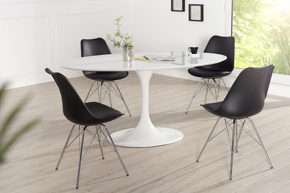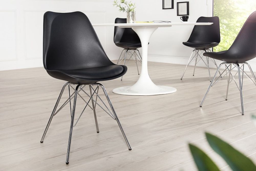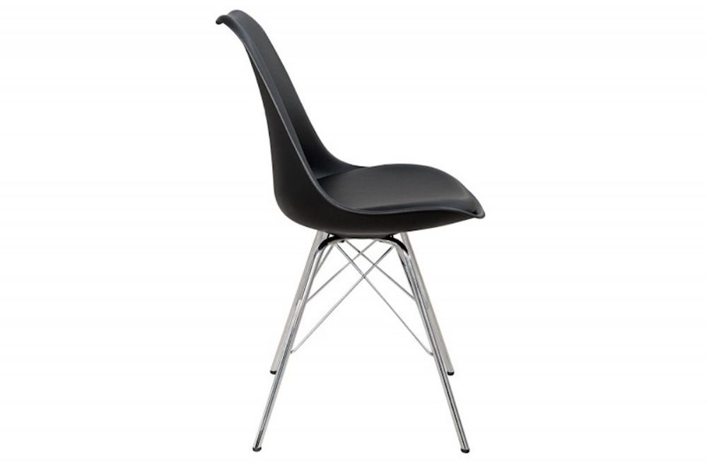 Ova stolica spaja jednostavnost skandinavskog dizajna s udobnošću. Njeno crno tapecirano sjedalo osigurava ugodno sjedenje, dok lagano nakošene metalne noge pružaju stabilnost i prirodni izgled. Čiste linije i skladan oblik čine je idealnim dodatkom modernom prostoru, unoseći suptilnu eleganciju i funkcionalnost.