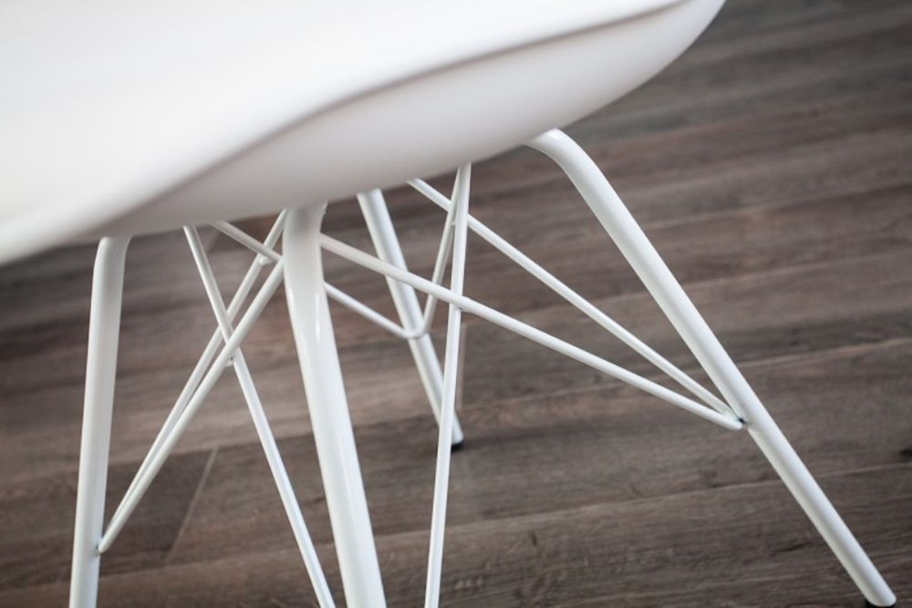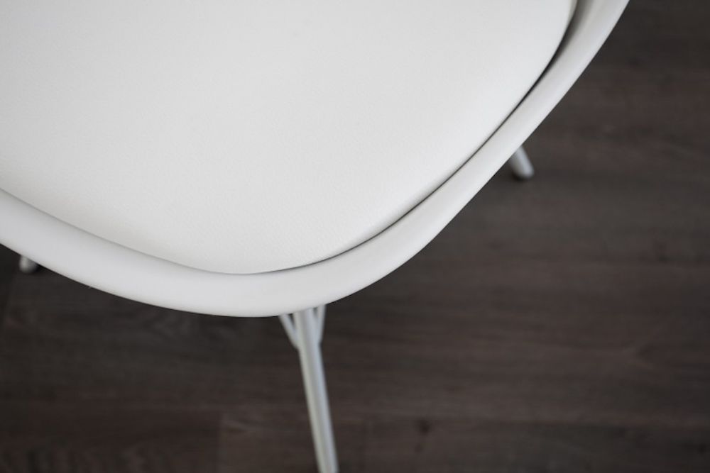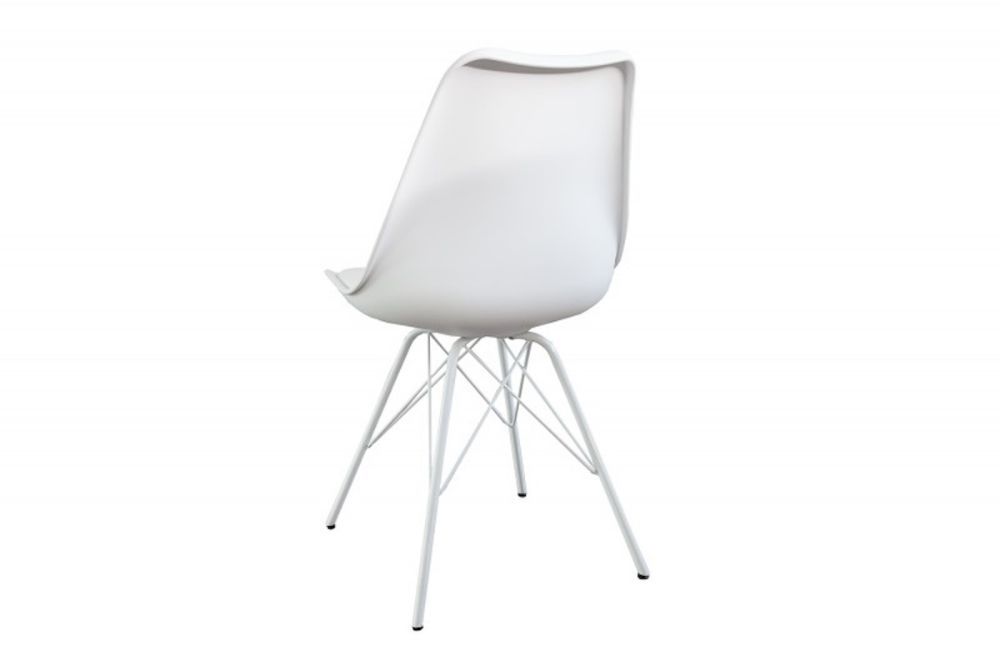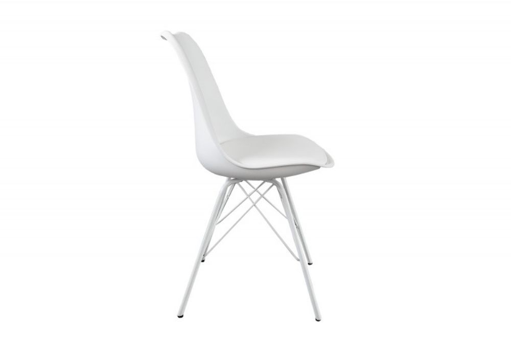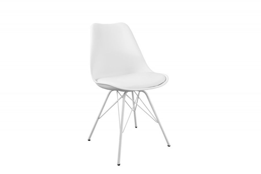 Ova stolica spaja jednostavnost skandinavskog dizajna s udobnošću. Njeno bijelo tapecirano sjedalo osigurava ugodno sjedenje, dok lagano nakošene metalne noge pružaju stabilnost i prirodni izgled. Čiste linije i skladan oblik čine je idealnim dodatkom modernom prostoru, unoseći suptilnu eleganciju i funkcionalnost.