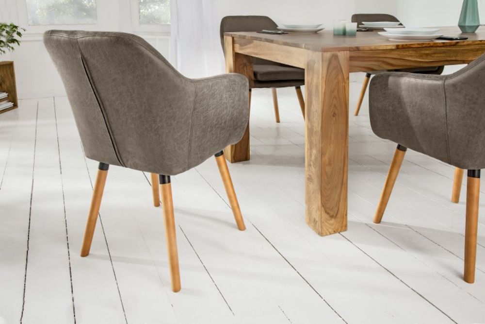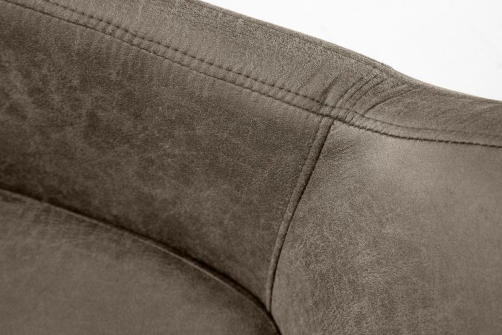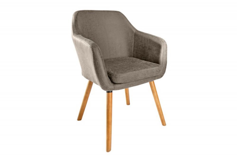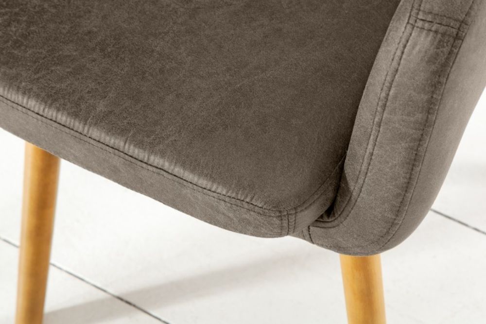Ova stolica elegantno spaja retro šarm i modernu udobnost. Tapecirana visokokvalitetnim mikrovlaknima u vintage taupe nijansi, donosi sofisticiran izgled s dozom rustikalnog karaktera. Površina je ugodno mekana na dodir, a šavovi na naslonu i sjedalu dodaju dodatni vizualni detalj. Ergonomski oblik prilagođen tijelu pruža dugotrajnu udobnost, dok drvene noge osiguravaju čvrstu stabilnost i suptilni industrijski dojam. Njena univerzalna estetika čini je savršenom za blagovaonice, radne prostore ili dnevne boravke, dodajući profinjenost svakom interijeru.
