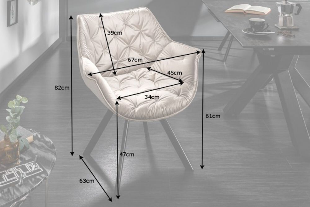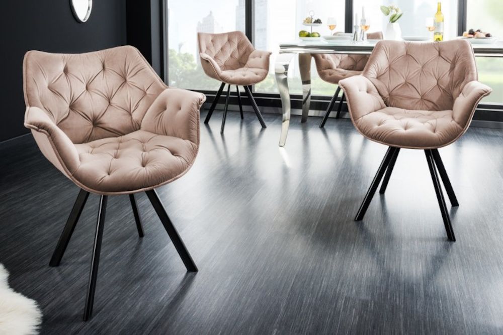 Ova stolica unosi dašak luksuza i udobnosti u svaki prostor. Presvučena glatkim baršunom u bež nijansi, pruža mekoću na dodir i suptilan sjaj koji privlači poglede. Svojim zaobljenim naslonom i dubokim sjedalom pruža udobnost za duge sate sjedenja. Metalne noge, fino izrađene, dodaju stabilnost i moderni kontrast prema baršunu, čineći ovu stolicu elegantnim izborom za blagovaonice, dnevne boravke ili radne prostore kojima želite dati notu elegancije.