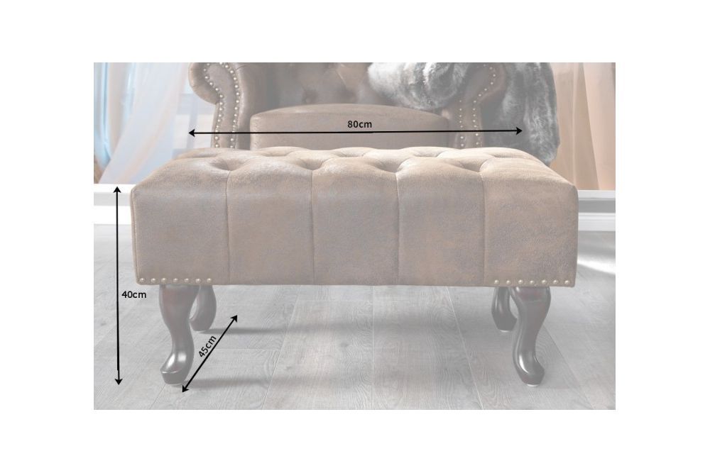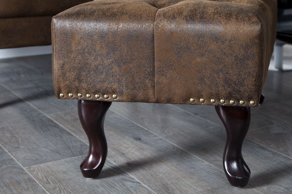 Presvlaka u smeđoj boji s antik izgledom odiše toplinom i bogatstvom prošlih vremena, podsjećajući na namještaj iz starih salona, gdje je svaki komad nosio svoju priču. Mikrofibra, koja je 100% poliester, daje ovoj tabureu trajnost i lakoću održavanja, a istovremeno zadržava sofisticiranu teksturu koja podsjeća na kožu, savršeno usklađenu s rustikalnim karakterom.