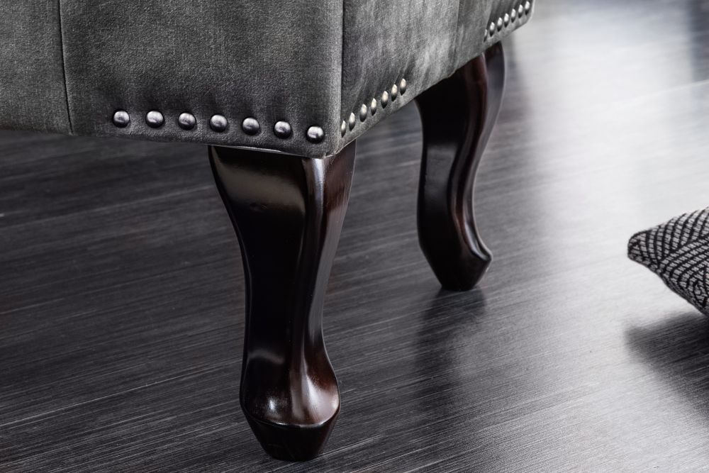 Okvir i noge od masivnog drva borovine pružaju mu stabilnost i dugovječnost, stvarajući čvrstu osnovu za dugoročno uživanje. Svojim jednostavnim, no snažnim izgledom, drvo donosi prirodnu eleganciju, koja se savršeno uklapa s Chesterfield stilom taburea. Ukrasne zakovice i dekorativni prošivi nadopunjuju cijeli izgled, dodajući mu elegantnu dramatičnost koja ga čini unikatnim, a opet nenametljivim u svom prostoru.