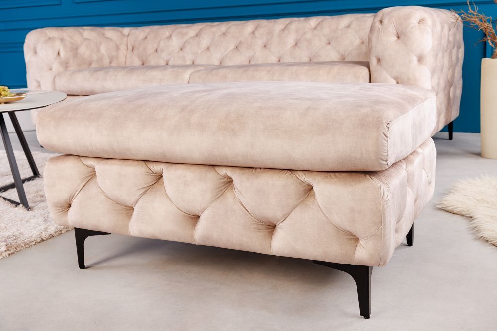 Chesterfield dizajn, s klasičnim dekorativnim prošivima, evocira tradiciju i raskoš prošlih vremena, dok baršunasta presvlaka u šampanjcu i crne metalne noge unose suvremenu notu. Jastuk s jezgrom opruga dodatno doprinosi udobnosti, podržavajući tijelo s blagim, ugodnim otporom, pozivajući na trenutke opuštanja.