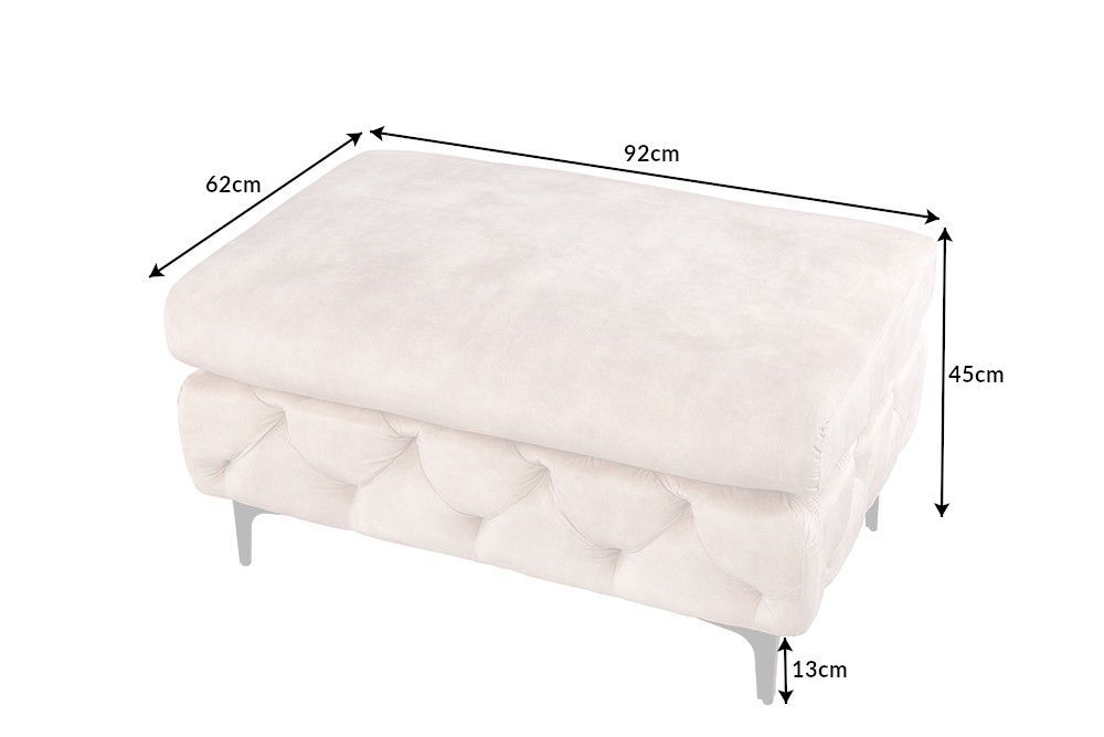 Ovaj tabure utjelovljuje eleganciju i luksuz, poput komada namještaja iz zlatnog doba interijera, ali s modernim dodirom. Dimenzija 92 cm širine, 45 cm visine i 62 cm dubine, dovoljno je prostran da bude središte pažnje, no dovoljno kompaktan da se lako uklopi u različite prostorije, od dnevnog boravka do elegantne spavaće sobe. Noge, visine 13 cm, podižu ga na profinjen način, dajući mu osjećaj lakoće i elegancije.
