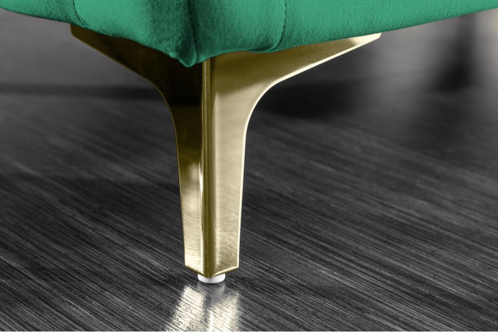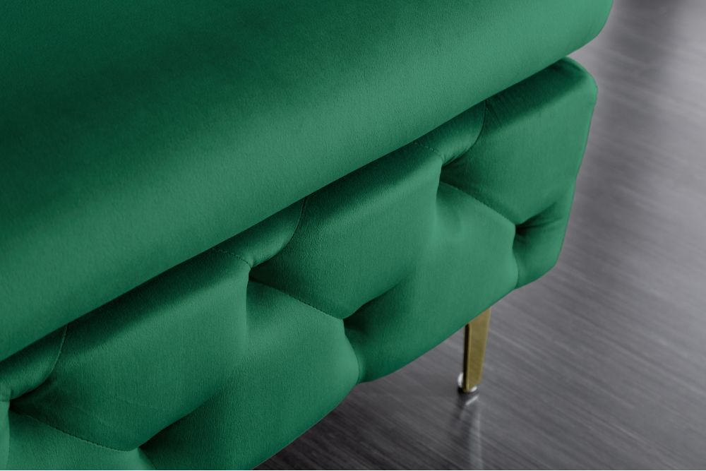 Chesterfield dizajn, s klasičnim dekorativnim prošivima, evocira tradiciju i raskoš prošlih vremena, dok baršunasta presvlaka u šampanjcu i crne metalne noge unose suvremenu notu. Jastuk s jezgrom opruga dodatno doprinosi udobnosti, podržavajući tijelo s blagim, ugodnim otporom, pozivajući na trenutke opuštanja.