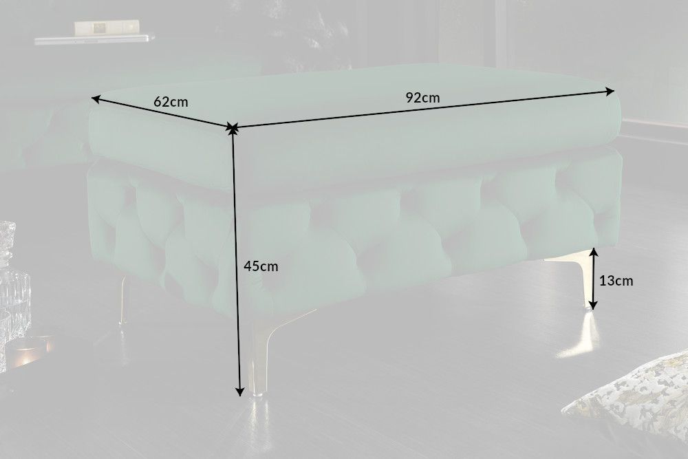 Ovaj tabure utjelovljuje eleganciju i luksuz, poput komada namještaja iz zlatnog doba interijera, ali s modernim dodirom. Dimenzija 92 cm širine, 45 cm visine i 62 cm dubine, dovoljno je prostran da bude središte pažnje, no dovoljno kompaktan da se lako uklopi u različite prostorije, od dnevnog boravka do elegantne spavaće sobe. Noge, visine 13 cm, podižu ga na profinjen način, dajući mu osjećaj lakoće i elegancije.