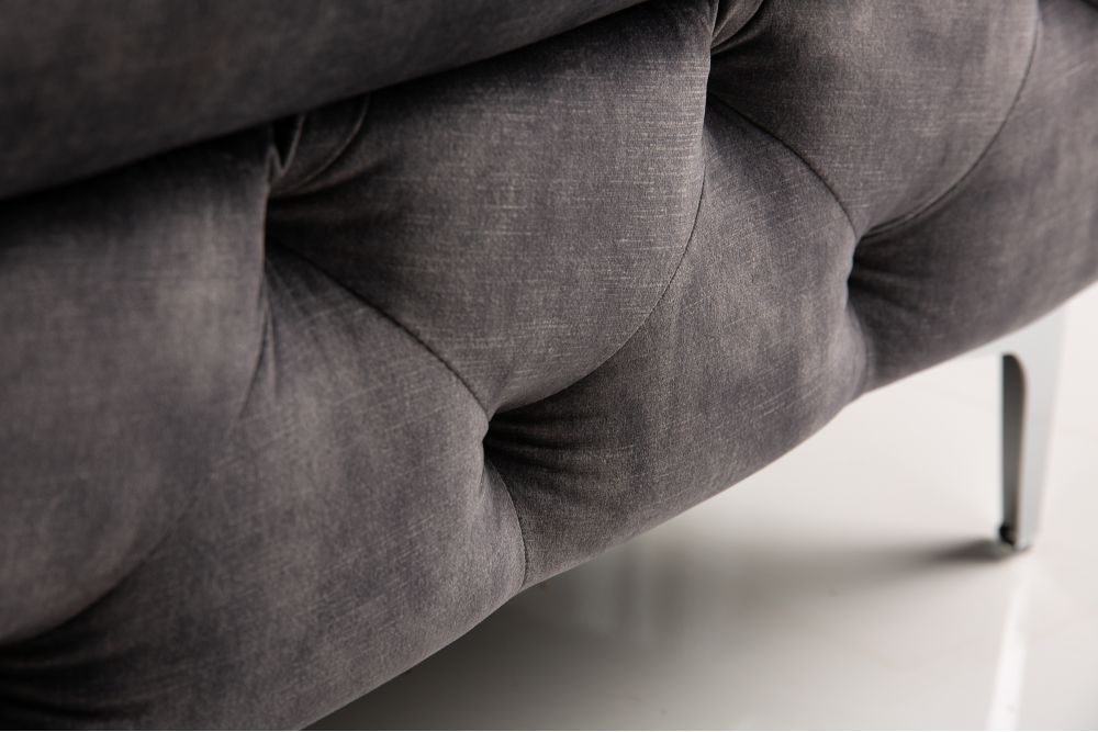 Chesterfield dizajn, s klasičnim dekorativnim prošivima, evocira tradiciju i raskoš prošlih vremena, dok baršunasta presvlaka u šampanjcu i crne metalne noge unose suvremenu notu. Jastuk s jezgrom opruga dodatno doprinosi udobnosti, podržavajući tijelo s blagim, ugodnim otporom, pozivajući na trenutke opuštanja.