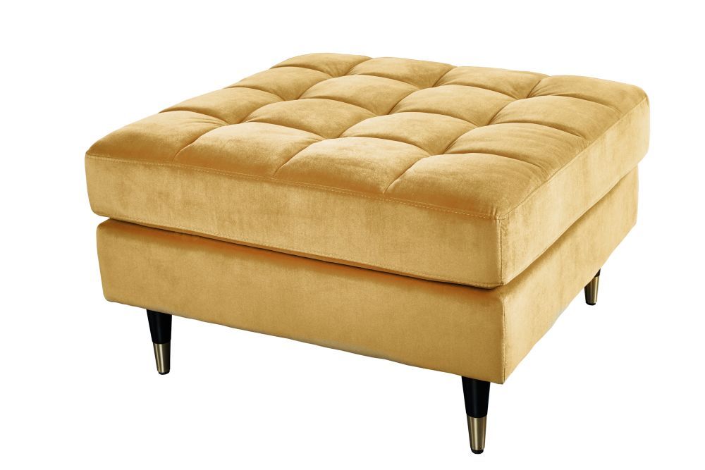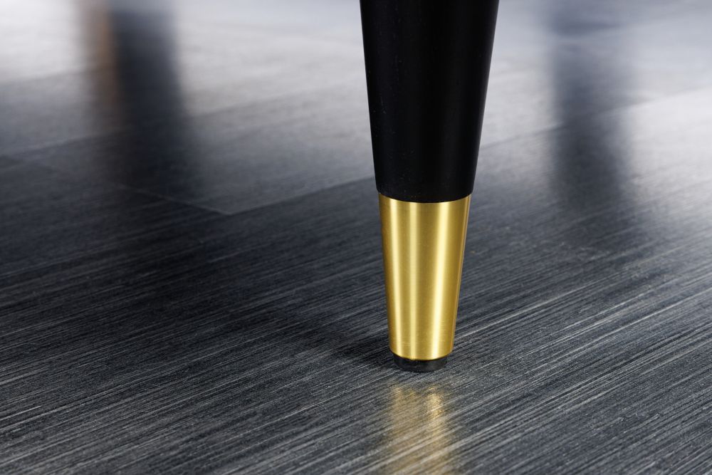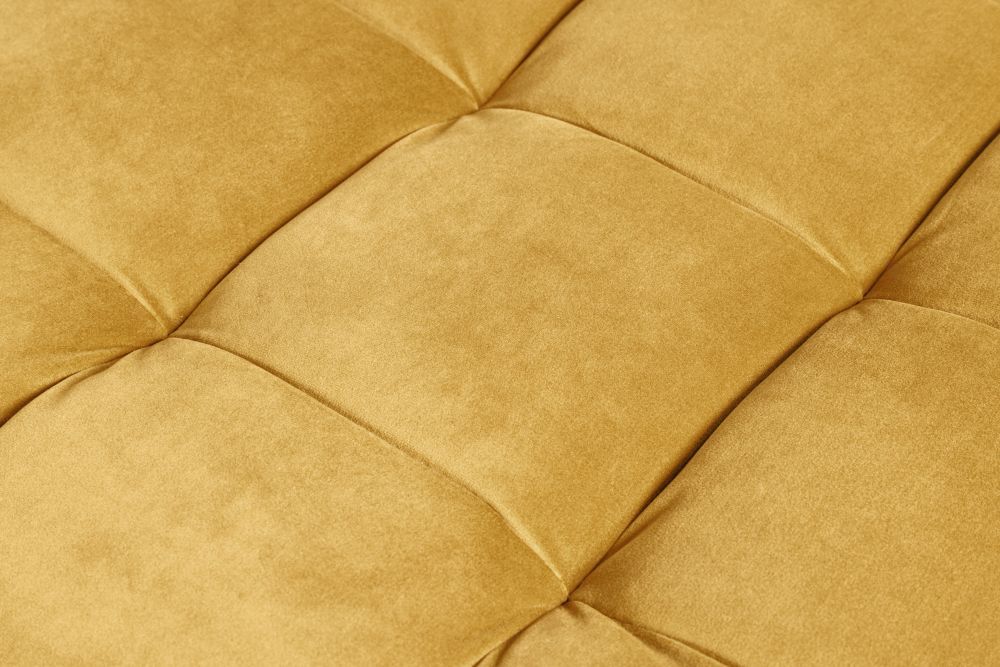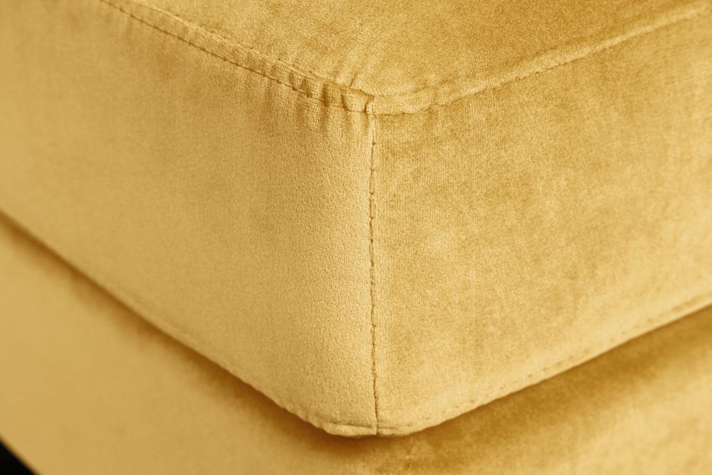 Obučen u nježni, oker baršun, čini se kao da vas poziva na opuštanje i ugodu. Baršunasta tkanina od 100% poliestera zrači toplinom i mekoćom, a pod prstima pruža senzaciju koja priziva spokoj i luksuz prošlih vremena. Noge, izrađene od čvrstog drveta kaučukovca, dodatno su naglašene zlatnim kapicama na krajevima, stvarajući sklad između prirodnih i metalnih elemenata. Crna boja nogu uz zlatne detalje daje mu dašak sofisticiranosti, istovremeno stabilnog i luksuznog izgleda.