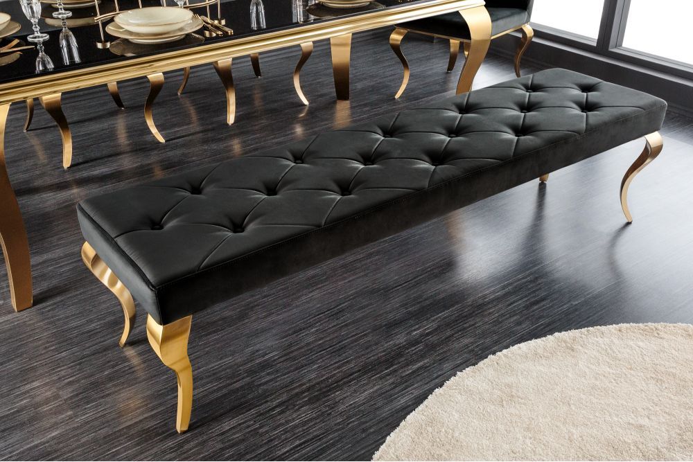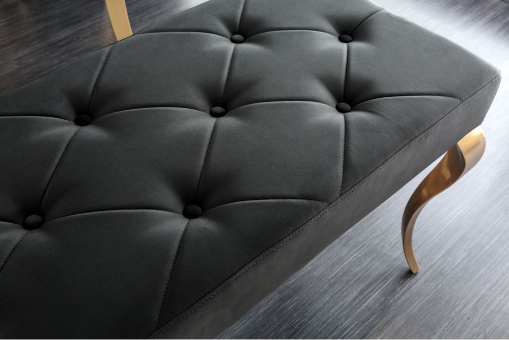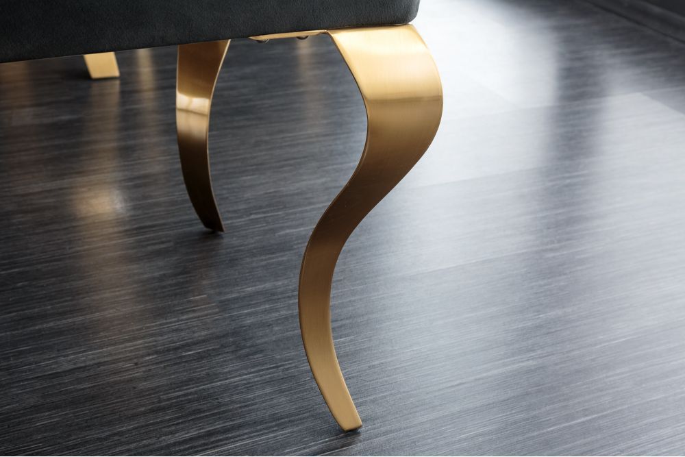 Noge klupe, izrađene od nehrđajućeg čelika i u zlatnoj boji, dodaju dozu glamura i sofisticiranosti. Ovaj kontrast između luksuznog baršuna i blistavog metala stvara vizualnu napetost koja očarava i privlači pažnju. Zlatne noge ne samo da osiguravaju stabilnost, već i unose dašak moderne elegancije u svaki prostor.