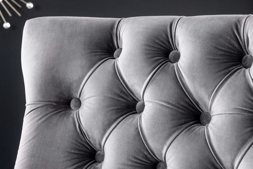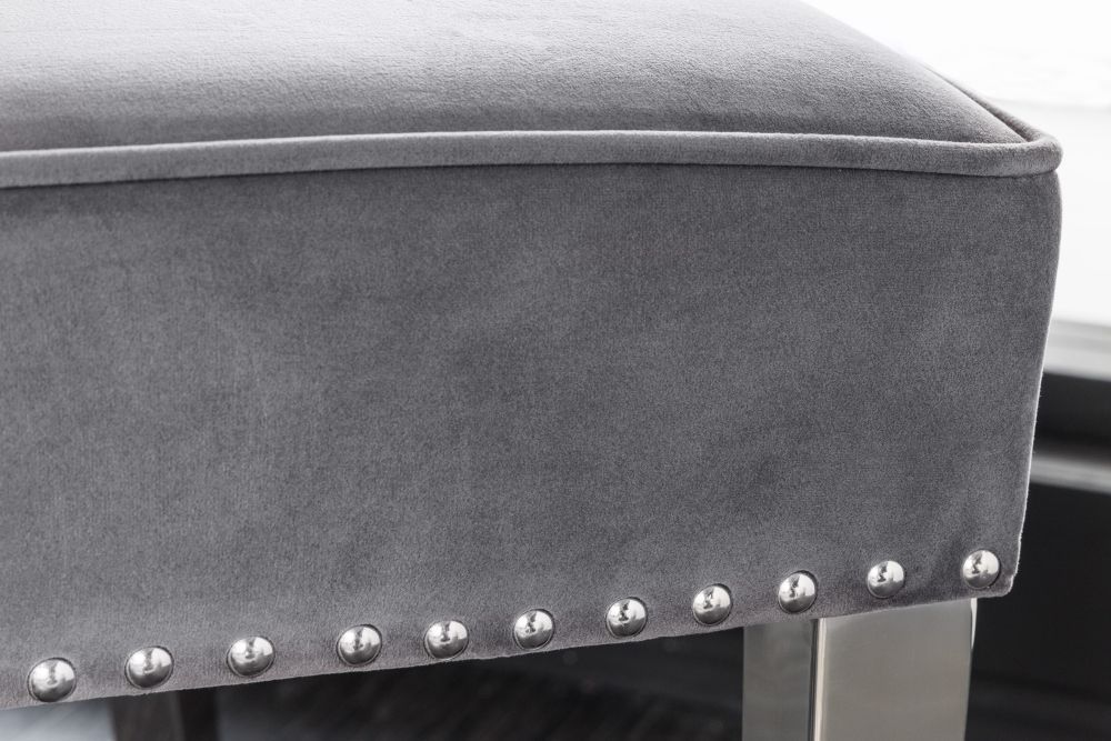 Ova predivna tapicirana klupa utjelovljuje raskoš i sofisticiranost baroknog stila, spoj suvremenih materijala i klasične elegancije. Visokokvalitetna baršunasta presvlaka u bogatoj sivoj nijansi pruža mekoću i luksuzan dodir, dok njezine sjajne noge od poliranog nehrđajućeg čelika reflektiraju svjetlost, stvarajući profinjeni kontrast. Ukrasni gumbi i prošivi na naslonu evociraju tradicionalni dizajn, donoseći dašak bogate povijesti u moderni interijer.