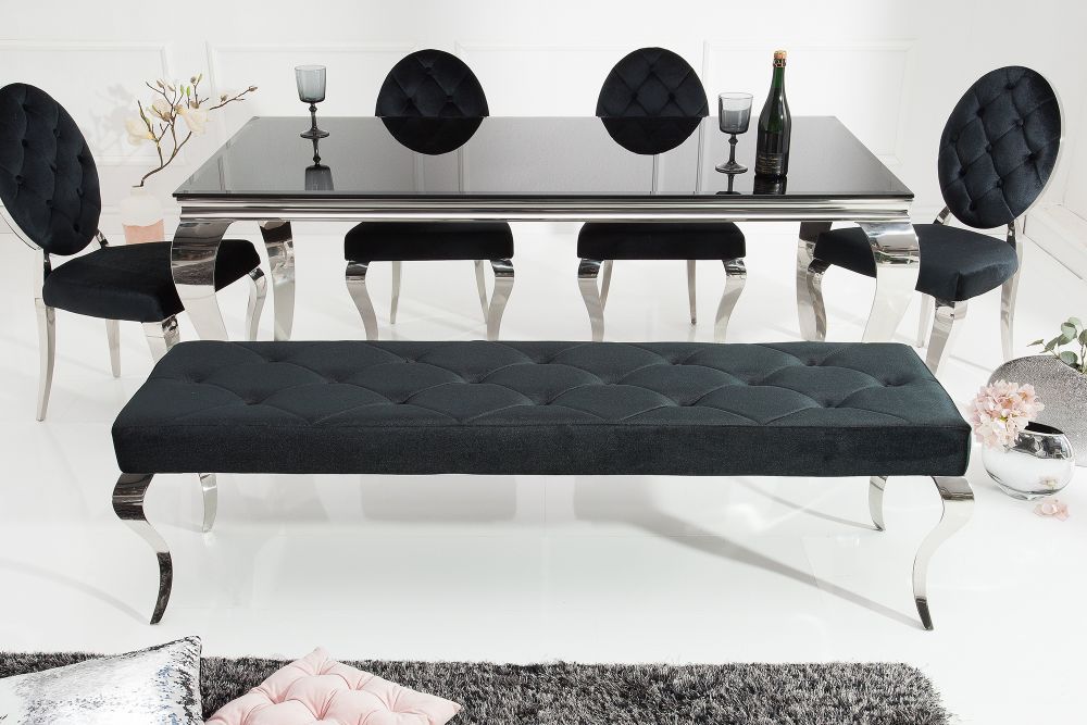 Ova tapecirana klupa utjelovljuje minimalistički luksuz i suvremeni dizajn. Sa svojih elegantnih 172 cm dužine, pruža izdašnu površinu za sjedenje, dok je njezina crna baršunasta presvlaka poput tame koja poziva na opuštanje i introspekciju. Baršun, izrađen od 100% poliestera, odiše suptilnim sjajem, hvatajući svjetlost na sofisticiran način, stvarajući kontrast između meke, taktilne teksture i hladne preciznosti njezinih nogu od nehrđajućeg čelika.