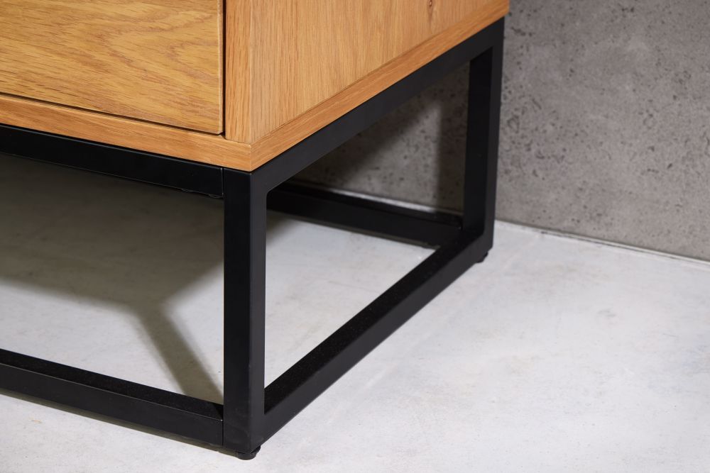 Ormarić ima dimenzije otprilike 150 cm x 60 cm x 40 cm (ŠxVxD), što ga čini kompaktnim, ali funkcionalnim komadom namještaja. Njegov gornji dio ima prirodnu drvenu površinu, izrađenu od hrastovog furnira, s vidljivim prirodnim godovima i toplim tonovima drva. Crna ukrasna letvica dodaje kontrast i savršeno se uklapa s modernim metalnim okvirom. Okvir ormarića, dimenzija 2 cm x 2 cm (ŠxD), izrađen je od crnog željeza s premazom u prahu, što mu daje čvrstinu i stabilnost.