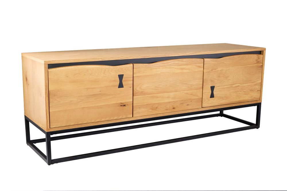 Elegantan i moderan TV ormarić s naglašenom kombinacijom prirodnog drva i crnih metalnih elemenata. Ormarić ima dva velika ormarića s podesivim policama, idealna za pohranu raznih predmeta, dok su vrata ormarića dizajnirana s jednostavnim, ali upečatljivim crnim detaljima u obliku leptira, koji doprinose estetskoj privlačnosti.