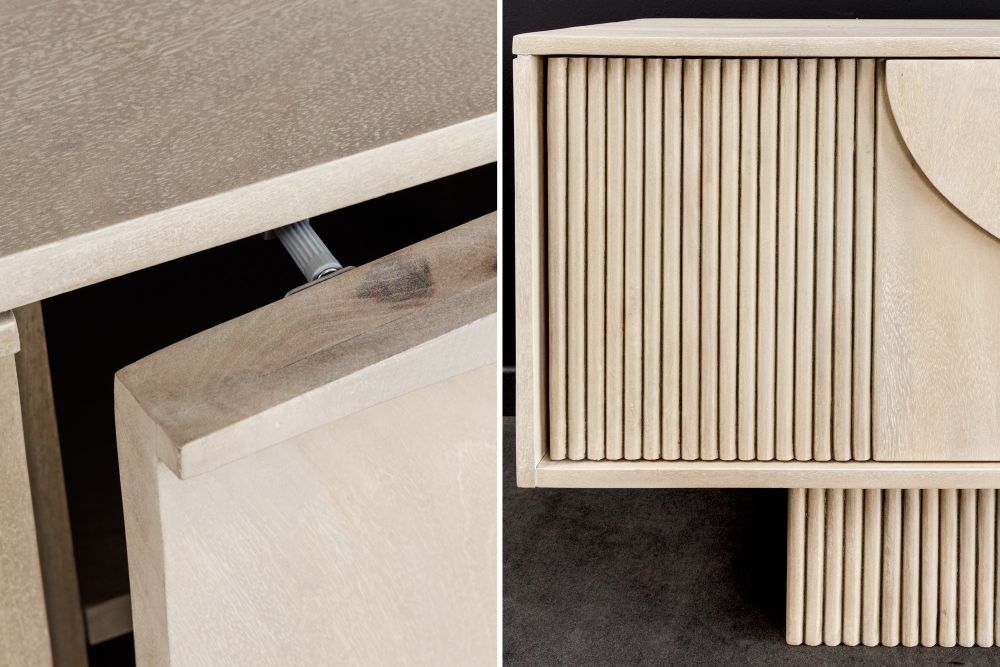 Izrađen od mango drva, stolić donosi toplinu i autentičnost, dok bijelo krečena završna obrada unosi svježinu i prozračnost u prostor. Ova kombinacija boja stvara harmoničan kontrast, istovremeno naglašavajući prirodne teksture drva. Njegova površina, s pažljivo oblikovanim detaljima, stvara dojam sofisticiranosti i modernosti, dok se 3D efekti čine kao da se neprestano mijenjaju s kretanjem svjetlosti.