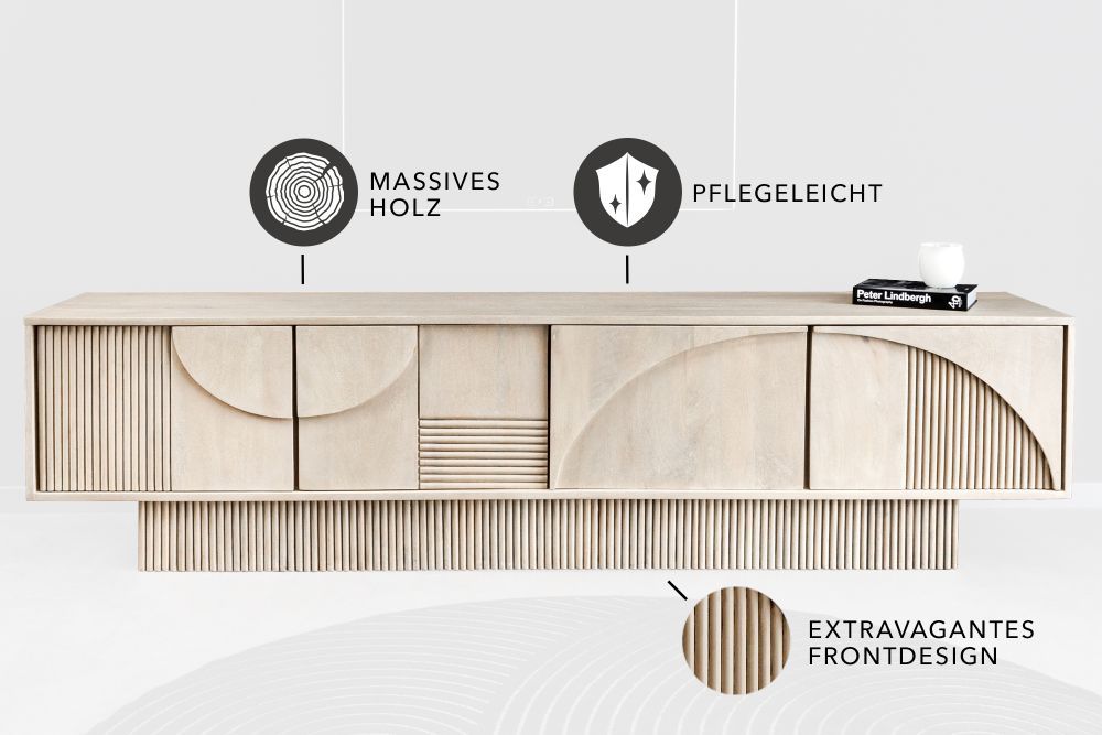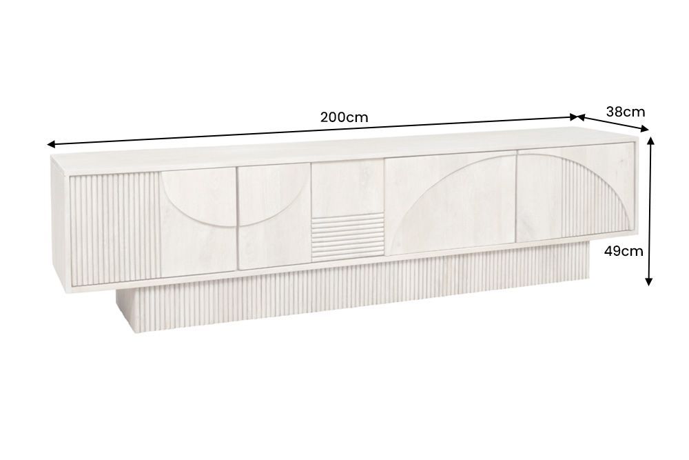 televizijski stolić koji ne samo da služi kao funkcionalan komad namještaja, već i kao prava umjetnička instalacija koja transformira prostor. Ovaj stolić s ekstravagantnom 3D površinskom obradom stvara dinamičnu igru svjetlosti i sjene, privlačeći poglede i potičući radoznalost. Njegova dimenzija od 200 cm x 49 cm x 38 cm čini ga savršeno prilagodljivim za bilo koji dnevni boravak, pružajući dovoljno prostora za smještaj svih vaših medijskih uređaja, ali i za isticanje dekorativnih elemenata.