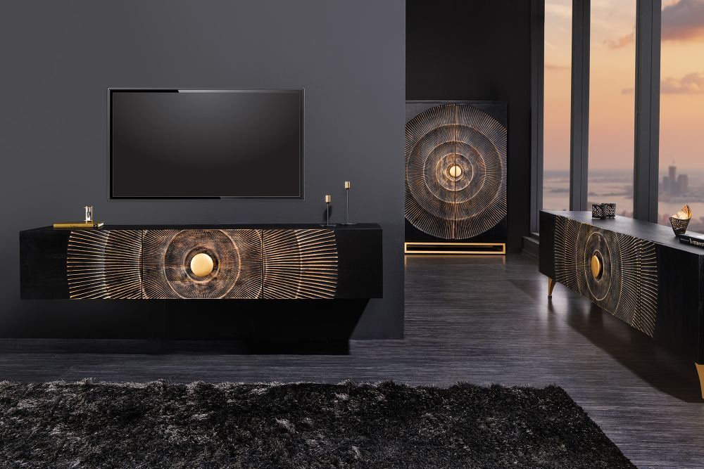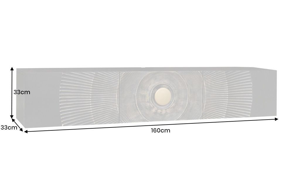 Ovaj TV stolić ističe se elegantnim dizajnom i bogato ukrašenim vratima s ornamentima, koja dodaju dašak sofisticiranosti. Njegova dimenzija od približno 160 cm u širini, 33 cm u visini i 33 cm u dubini čini ga savršenim rješenjem za svaki prostor.