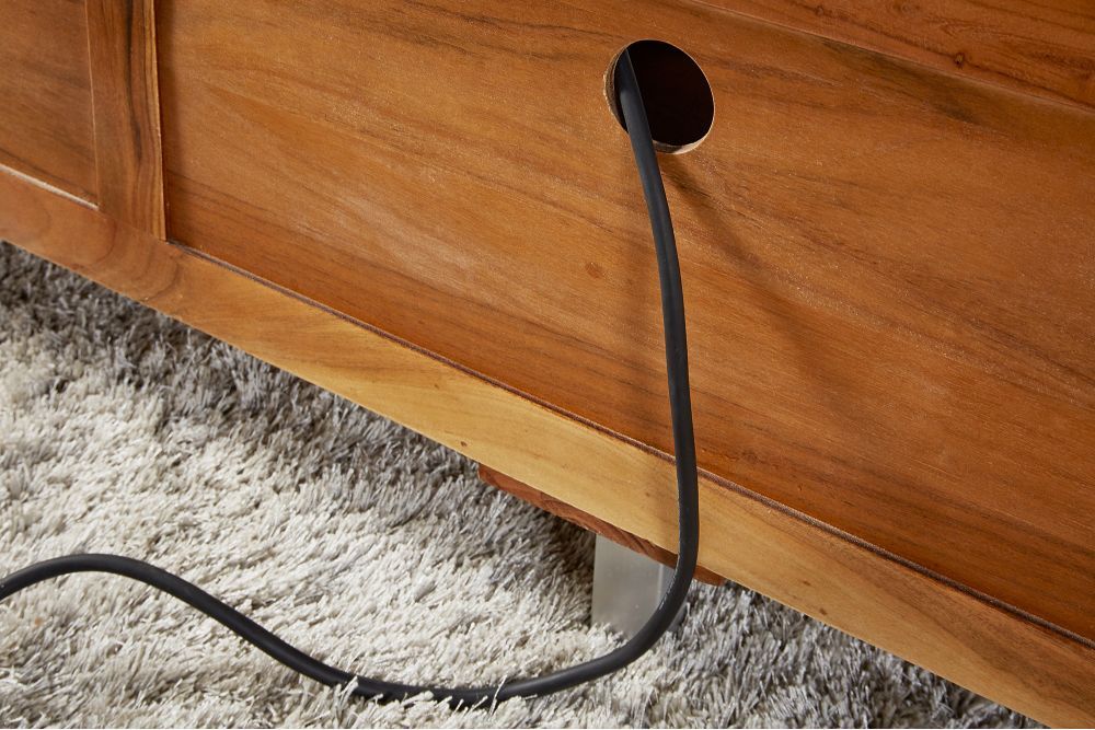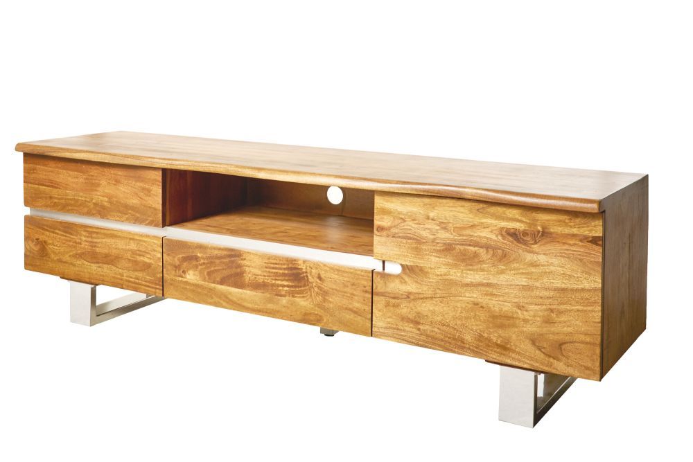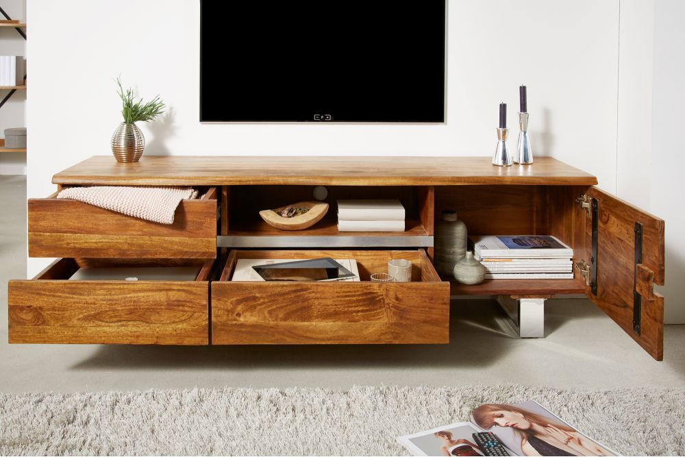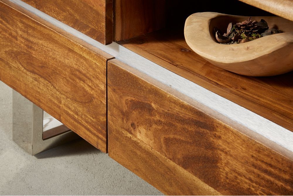 TV stolić izrađen od masivnog bagremovog drveta u prirodnom mednom tonu, spaja industrijsku estetiku s toplinom prirodnog materijala. S dimenzijama od 160 cm širine, 50 cm visine i 43 cm dubine, ovaj komad namještaja pruža prostranu površinu i stabilnost. Njegovo lakirano drvo naglašava bogatu teksturu i prirodne uzorke, čineći ga vizualno privlačnim i funkcionalnim.