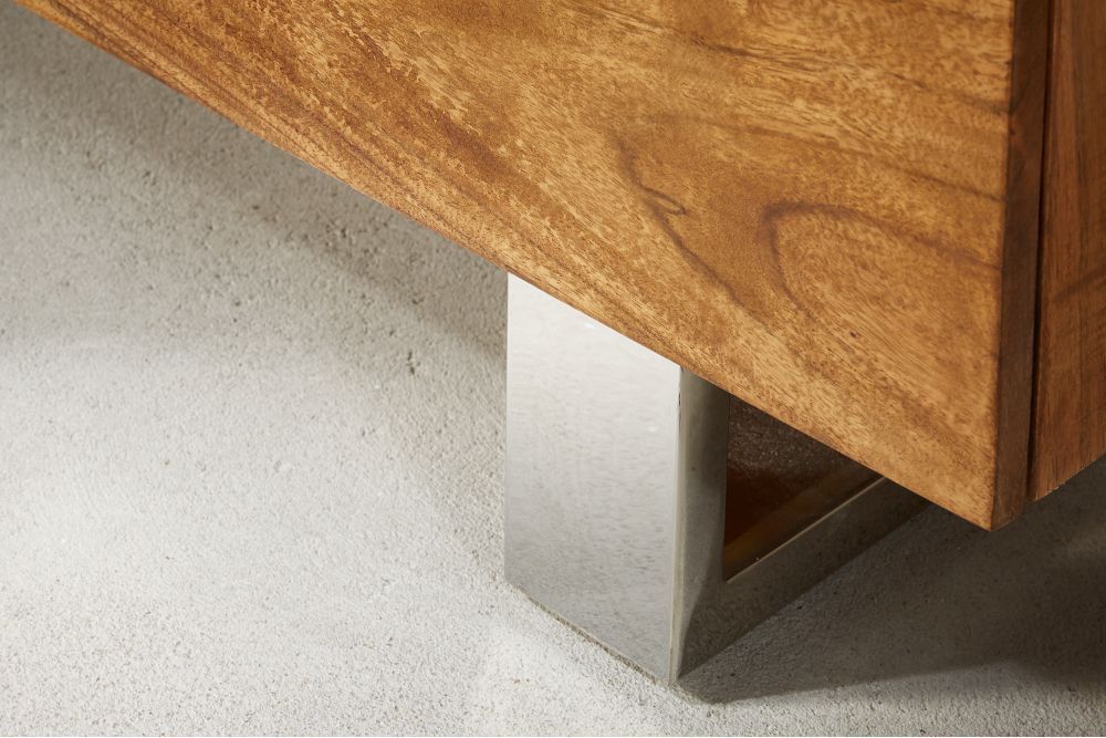 Polirani okvir od nehrđajućeg čelika u srebrnoj boji donosi moderan, industrijski izgled i savršeno se stapa s prirodnom ljepotom drveta. Ravne linije i minimalistički dizajn pojačavaju osjećaj modernosti, dok precizno obrađeni detalji na spojevima drveta i metala ističu visoku kvalitetu izrade.