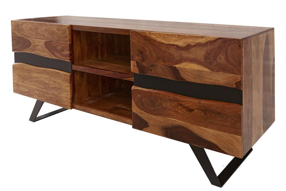 Ovaj TV stolić očarava svojim grubim industrijskim stilom, kombinirajući prirodne elemente s modernim dizajnom. Njegova dimenzija od približno 160 cm dužine, 63 cm visine i 45 cm dubine čini ga savršenim komadom namještaja za svaki dnevni boravak. Izrađen je od masivnog drva šisame, koje se ponosi svojim prirodnim rubom, dajući svakom komadu jedinstvenu i autentičnu notu.