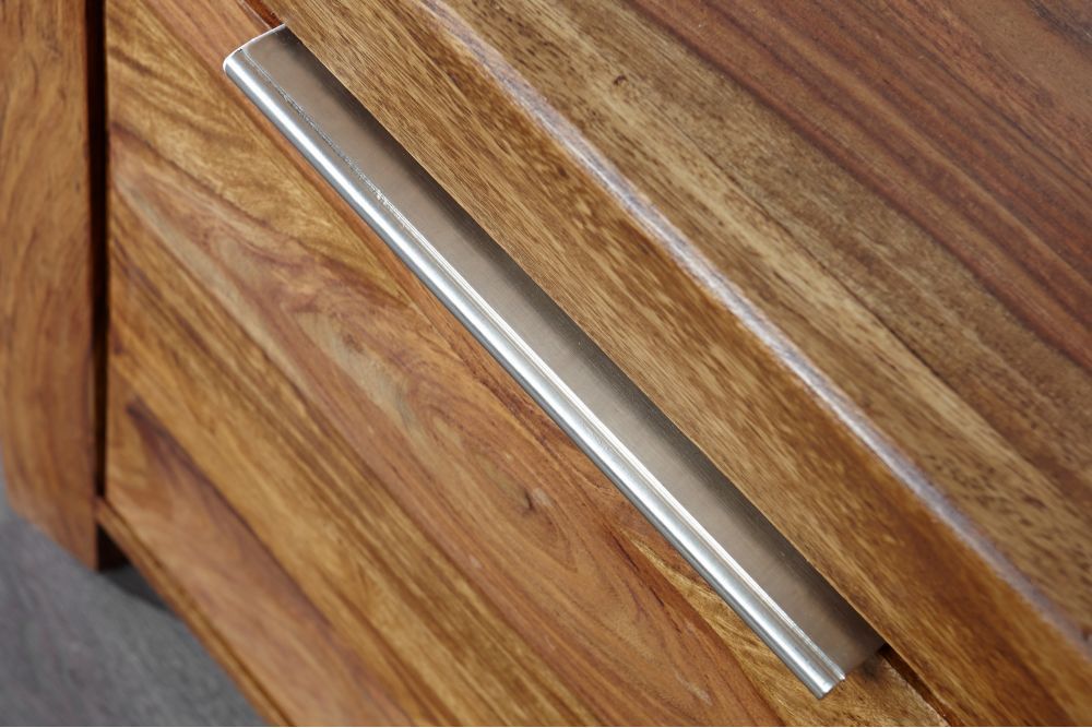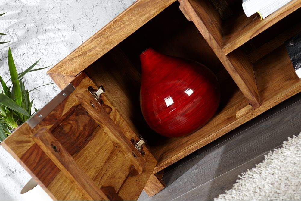 Na slici je TV stolić izrađen od masivnog Sheesham drva, s prirodnom bojom koja naglašava prirodnu teksturu drveta. Dimenzije su otprilike 135 cm širine, 50 cm visine i 45 cm dubine. Stolić ima dva otvorena pretinca smještena u sredini, dimenzija 43 cm x 16 cm x 40 cm, što je idealno za odlaganje knjiga ili multimedijskih uređaja. S obje strane nalaze se pretinci s vratima, dimenzija 43 cm x 40 cm x 39 cm, te ispod njih po dvije ladice, dimenzija 32 cm x 12 cm x 34 cm, za dodatno spremište.