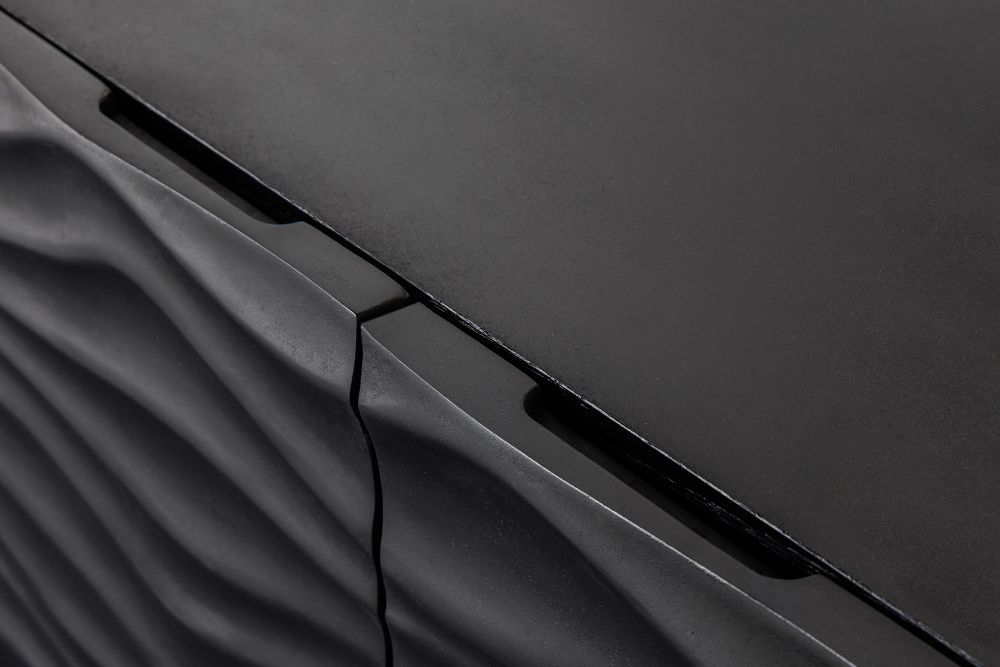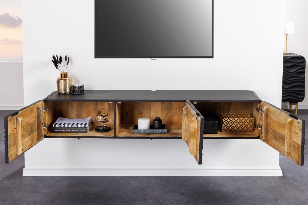 Moderan, viseći TV stolić s minimalističkim, a upečatljivim dizajnom. Prednji dio stolića krasi složen, apstraktan uzorak valova, koji daje 3D teksturu i stvara dinamičan izgled. Stolić je crne boje, a izrađen je od lakiranog drva manga, što mu daje elegantan, mat izgled. Njegova ravna površina pruža dovoljno prostora za dekorativne predmete, dok valoviti uzorak sprijeda naglašava njegovu ručnu izradu i sofisticiranost.