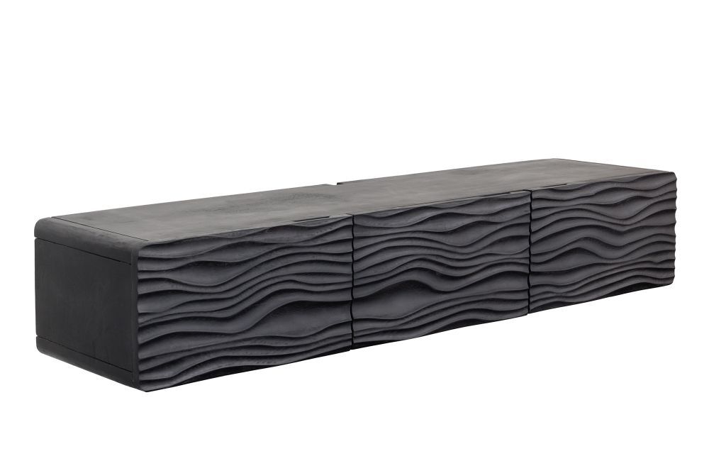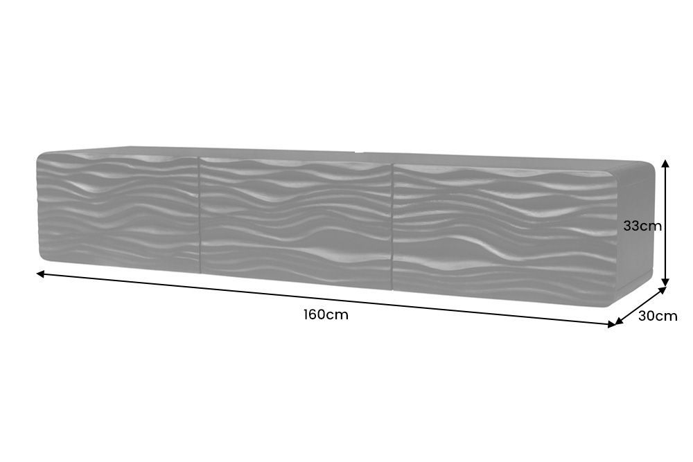 Dimenzije su otprilike 160 cm širine, 33 cm visine i 30 cm dubine, što ga čini idealnim za ugradnju ispod televizora na zidu, čime se postiže efekt lebdećeg komada namještaja. Kombinacija crne boje i organskih, valovitih linija daje mu modernu, ali i prirodnu estetiku.