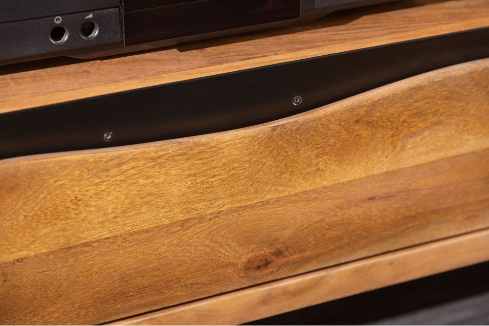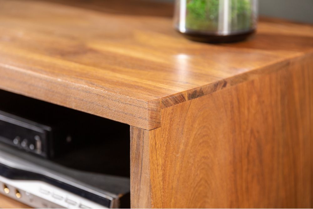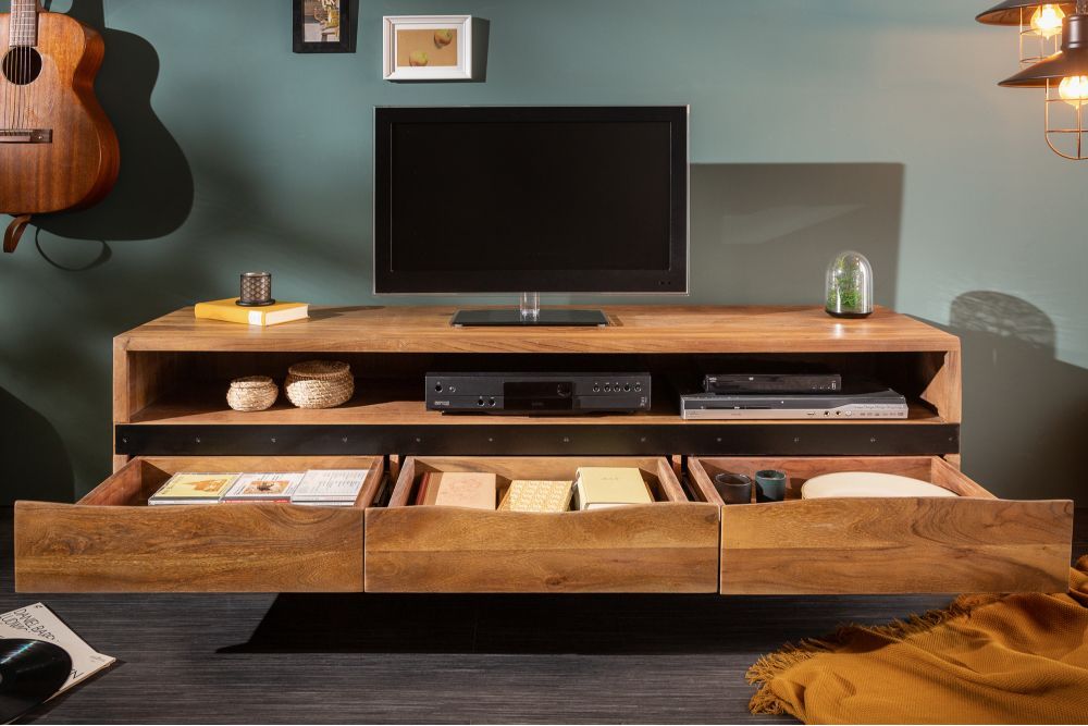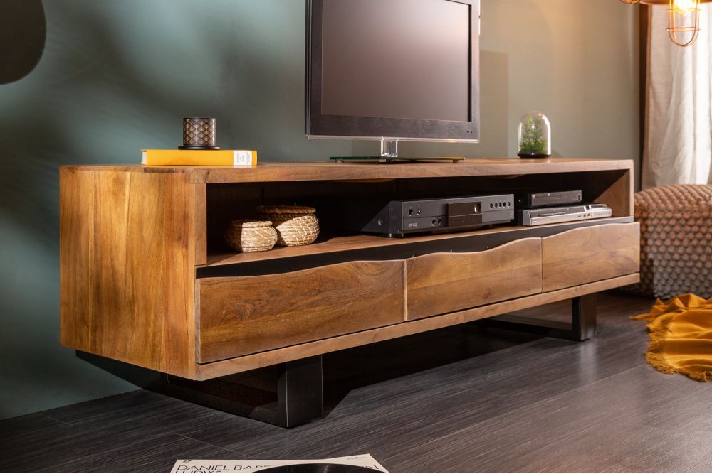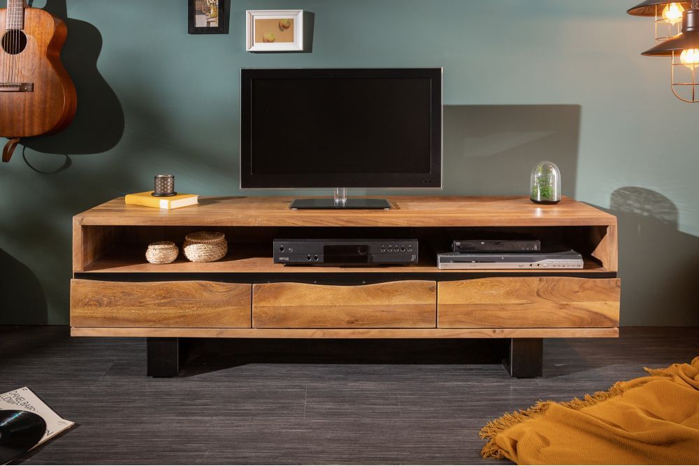 TV stolić izrađen od masivnog bagremovog drveta, koji očarava svojom prirodnom estetikom i čvrstoćom. Njegov vrh s prirodnim rubom stvara dojam autentičnosti, dok su izrađene ukrasne letvice dodane za sofisticiraniji izgled. S dimenzijama približno 160 cm u širinu, 50 cm u visinu i 41 cm u dubinu, stolić pruža dovoljno prostora za smještaj televizora i drugih uređaja.