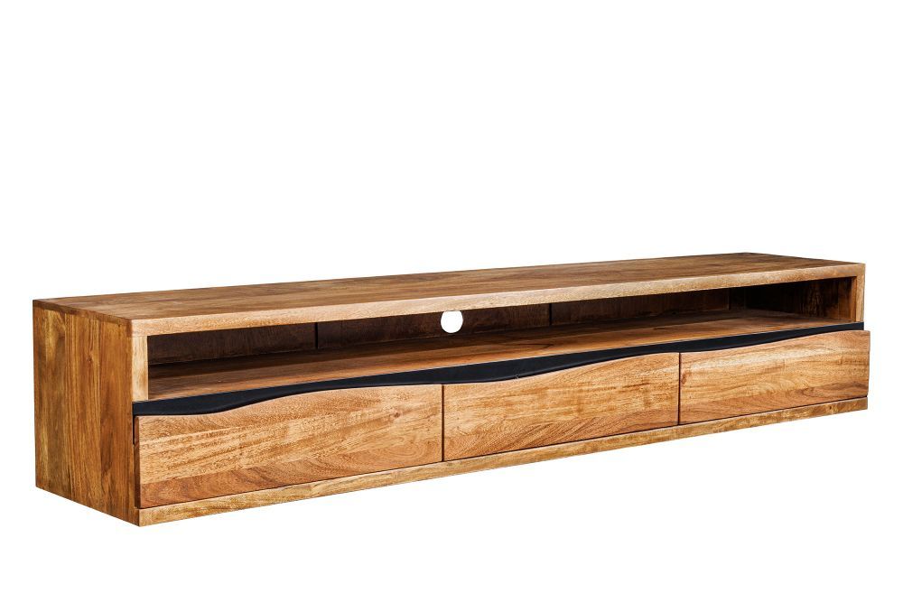 TV stolić na slici je moderan i minimalistički komad namještaja, izrađen od masivnog bagremovog drveta s naglašenim prirodnim rubom, što daje dojam organskih linija. Drvo ima predivan, prirodni medni ton, koji odiše toplinom i autentičnošću. Ladice (tri komada) imaju dimenzije od 53 cm širine i 14 cm visine, dok otvoreni pretinac, smješten odmah iznad ladica, ima visinu od 10 cm. Ovaj otvoreni prostor nudi praktičnost za postavljanje uređaja poput DVD playera ili ukrasnih predmeta.